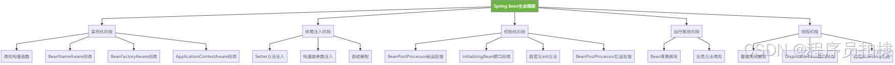 Spring Bean的生命周期包含多个阶段,每个阶段都有相应的回调机制: