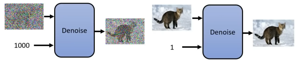 在上面过程中,可以看到去噪模型反复多次使用,但是由于每次输入的图片都不一样,若使用同一个参数模型则结果就不一定可以像上面一样。所以为了去噪模型能够“因材施教”,其输入除了一个图片外还要再增加一个数字输入,这个输入代表现在噪声的严重程度。从而去噪模型通过这个新增输入,不断调整去噪程度。
