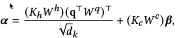 - Q 和 K 注意力分数的计算必须线上进行,论文提出了特征拆分和线性映射的思路,就是将item的特征拆解为item的固有属性Kh如item id、作者、主题等和item-user交叉特征Kc如用户的观看时长等。对于固有属性,可以提前计算KhWh并存储,线上推理不再进行额外计算;对于交叉特征,通过简单的线性映射,作为偏置项加入到最终的attention score中。