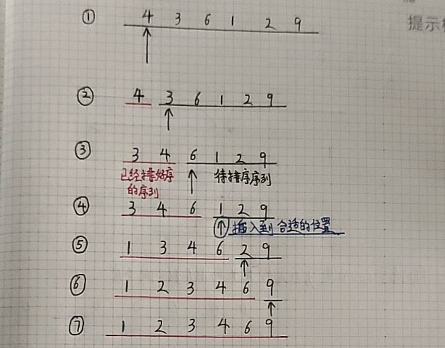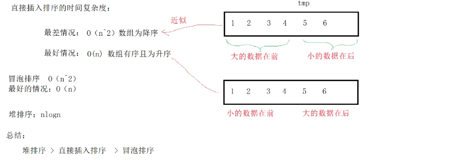 {for (int i = 0; i < n - 1; i++){int end = i;int tmp = arr[end + 1];while (end >= 0){if (arr[end] > tmp){arr[end + 1] = arr[end];end--;}else{break;}}arr[end + 1] = tmp;}