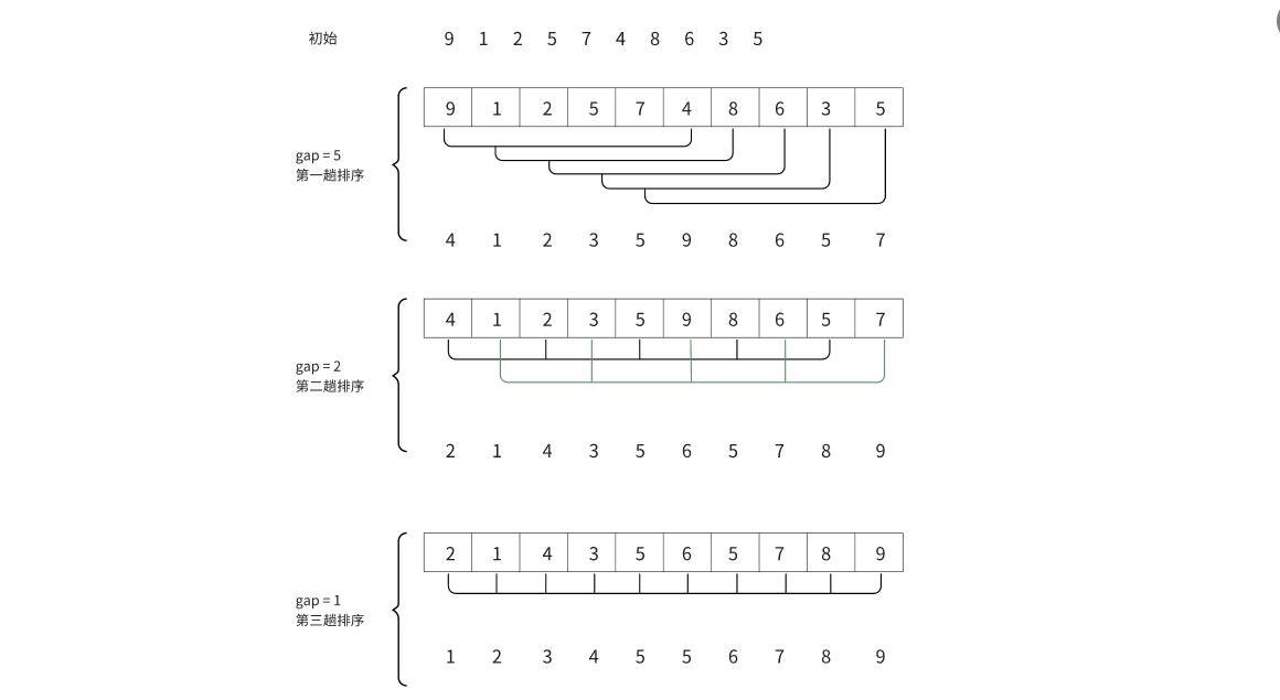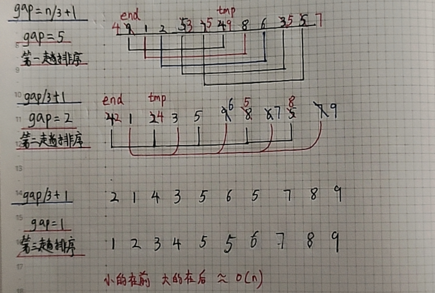 {int gap = n;while (gap > 1){gap = gap / 3 + 1;for (int i = 0; i < n - gap; i++){int end = i;int tmp = arr[end + gap];while (end >= 0){if (arr[end] > tmp){arr[end + gap] = arr[end];end -= gap;}else{break;}}arr[end + gap] = tmp;}}