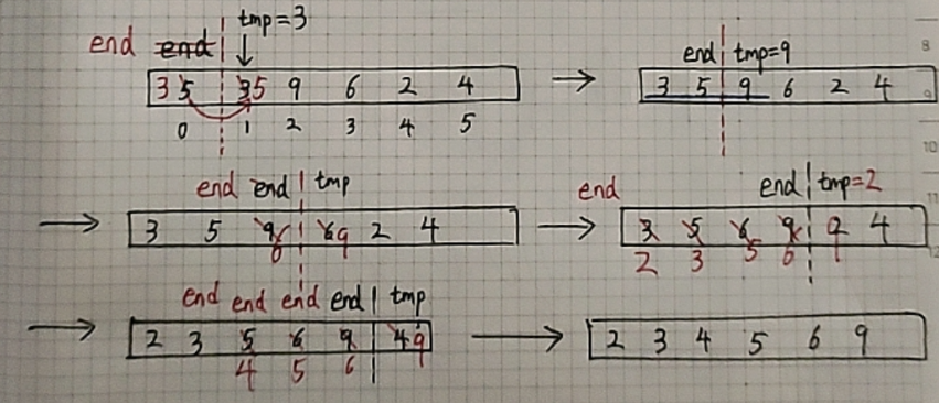 如果 tmp < arr[end],挪动数据 arr[end + 1] = arr[end],end--,继续比较。