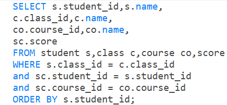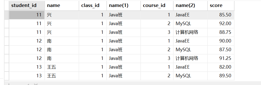学生id,学生姓名,所有班级名,课程和对应的成绩。