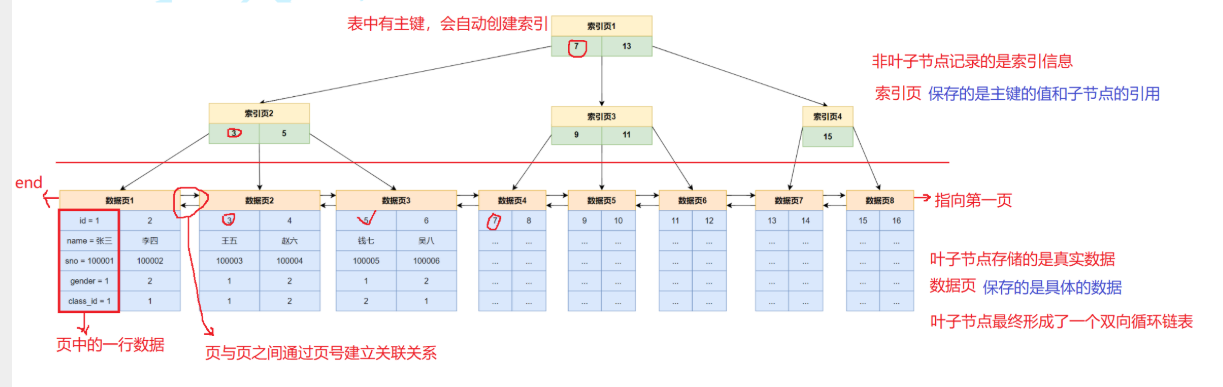 非叶子节点保存索引数据,叶子节点保存真实数据,如下图所示: