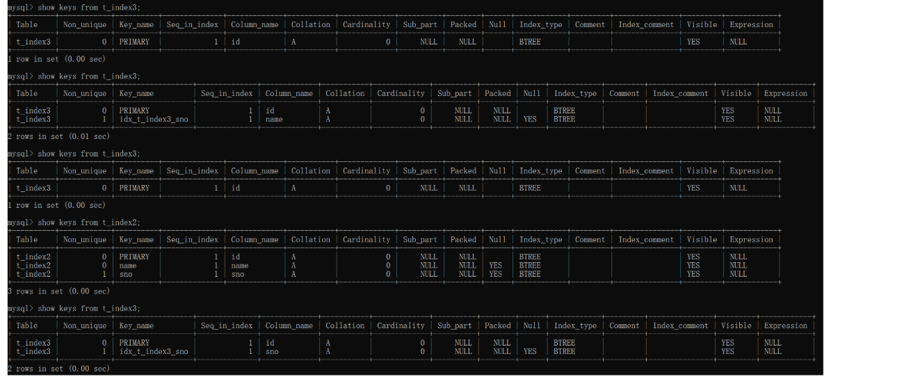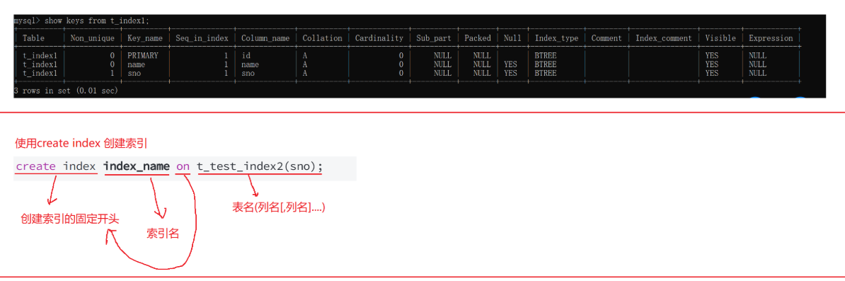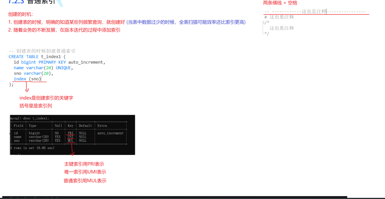 -- 创建表的时候创建普通索引CREATE TABLE index1(id BIGINT PRIMARY KEY auto_increment,name VARCHAR(30) UNIQUE,sn VARCHAR(20),INDEX (sn));-- 修改表中的列为普通索引CREATE TABLE index2(id BIGINT PRIMARY KEY auto_increment,name VARCHAR(30) UNIQUE,sn VARCHAR(20));ALTER TABLE index2 ADD INDEX(sn);-- 单独创建索引并指定索引名CREATE TABLE index3(id BIGINT PRIMARY KEY auto_increment,name VARCHAR(30),sn VARCHAR(30));-- 为name 列建立索引,不指定索引名时失败,必须要指定名字CREATE INDEX ON INDEX(name);-- 索引名推荐使用,idx_表名_列名[_列名]..CREATE INDEX idx_index3_sn ON index3(sn);ALTER TABLE index3 DROP index idx_index3_sn;