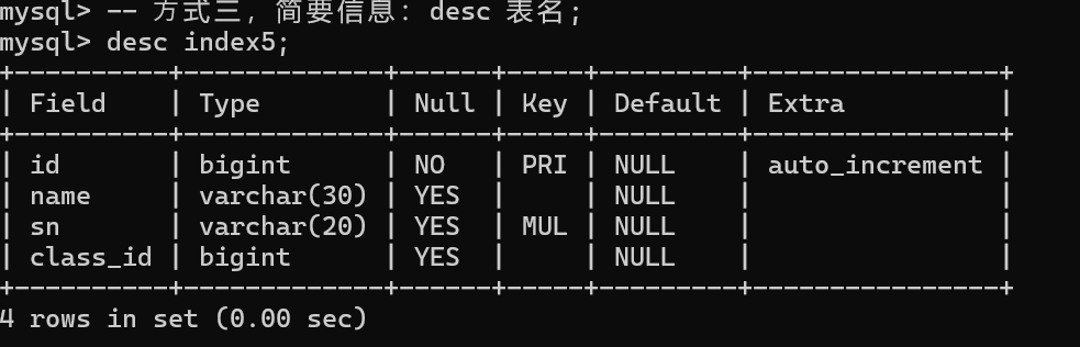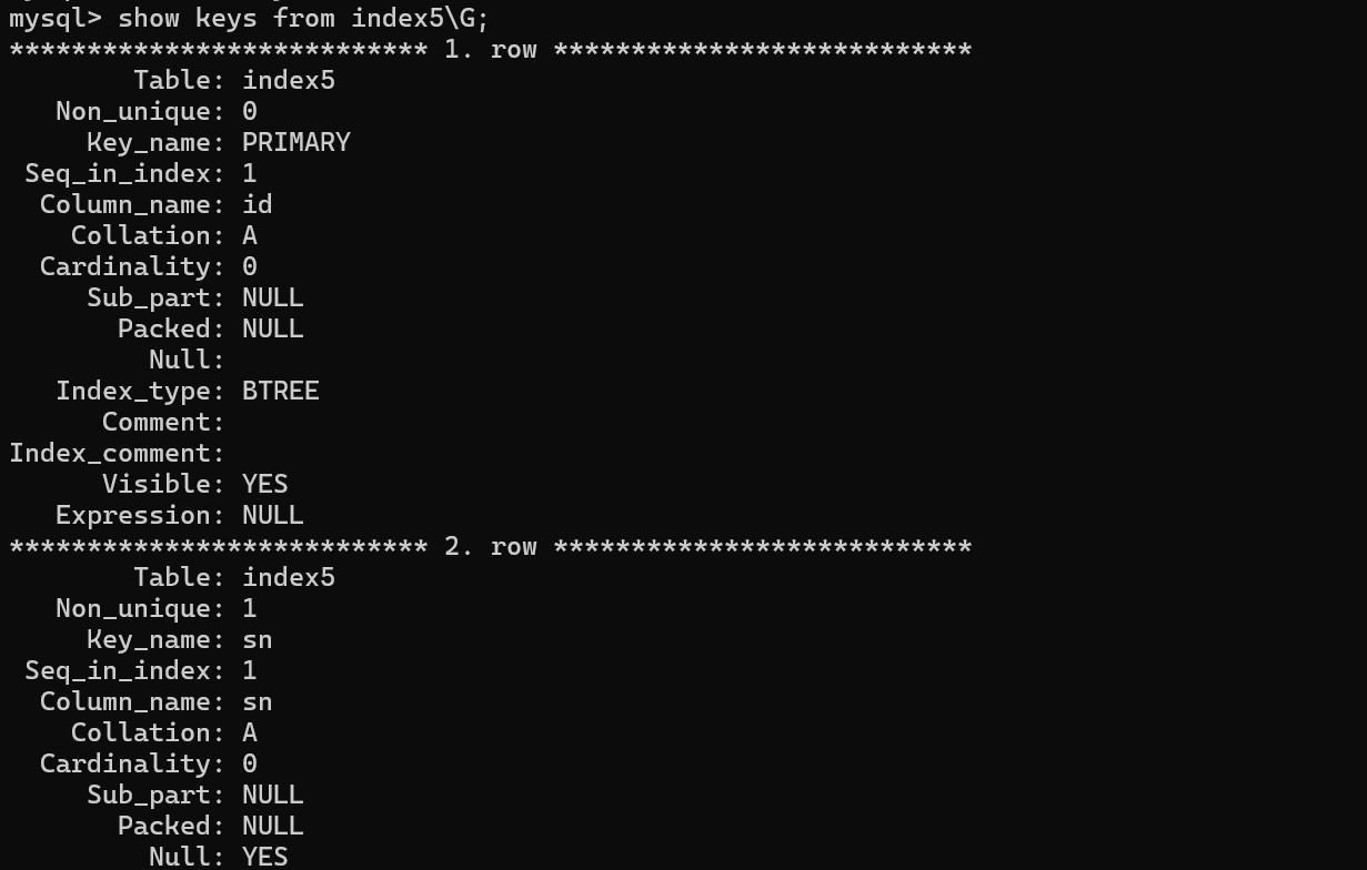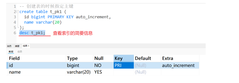 );-- 创建表时单独指定唯一列CREATE TABLE uk2(id BIGINT PRIMARY KEY auto_increment,name VARCHAR(30),UNIQUE (name));-- 修改表中的列为唯一索引CREATE TABLE uk3(id BIGINT PRIMARY KEY auto_increment,name VARCHAR(20));ALTER TABLE uk3 ADD UNIQUE (name);