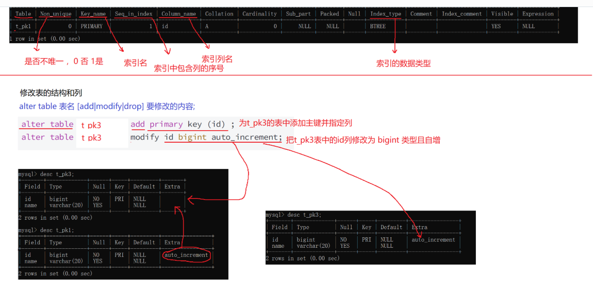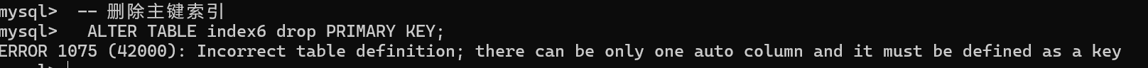 -- 删除索引-- 删除主键索引ALTER TABLE index6 drop PRIMARY KEY;-- 如果主键是自增列,先把自增列改成非自增ALTER TABLE index6 MODIFY id BIGINT;-- 再次执行删除主键