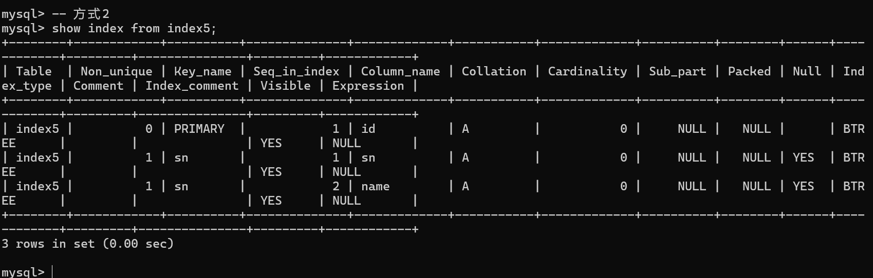 -- 创建复合索引-- 创建表时指定索引列CREATE TABLE index4(id BIGINT PRIMARY KEY auto_increment,name VARCHAR(30),sn VARCHAR(20),class_id BIGINT,INDEX(sn,name));-- 修改表中的列为复合索引CREATE TABLE index5(id BIGINT PRIMARY KEY auto_increment,name VARCHAR(30),sn VARCHAR(20),class_id BIGINT);ALTER TABLE index5 ADD INDEX (sn,name);-- 单独创建索引并指定索引名CREATE TABLE index6(id BIGINT PRIMARY KEY auto_increment,name VARCHAR(30),sn VARCHAR(20),class_id BIGINT);CREATE INDEX idx_index6_sn_name ON index6 (sn,name);