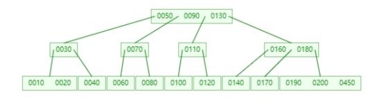 B+树是一种经常用于数据库和文件系统等场合的平衡查找树,MySQL索引采用的数据结构,以4阶B+树为例,如下图所示: