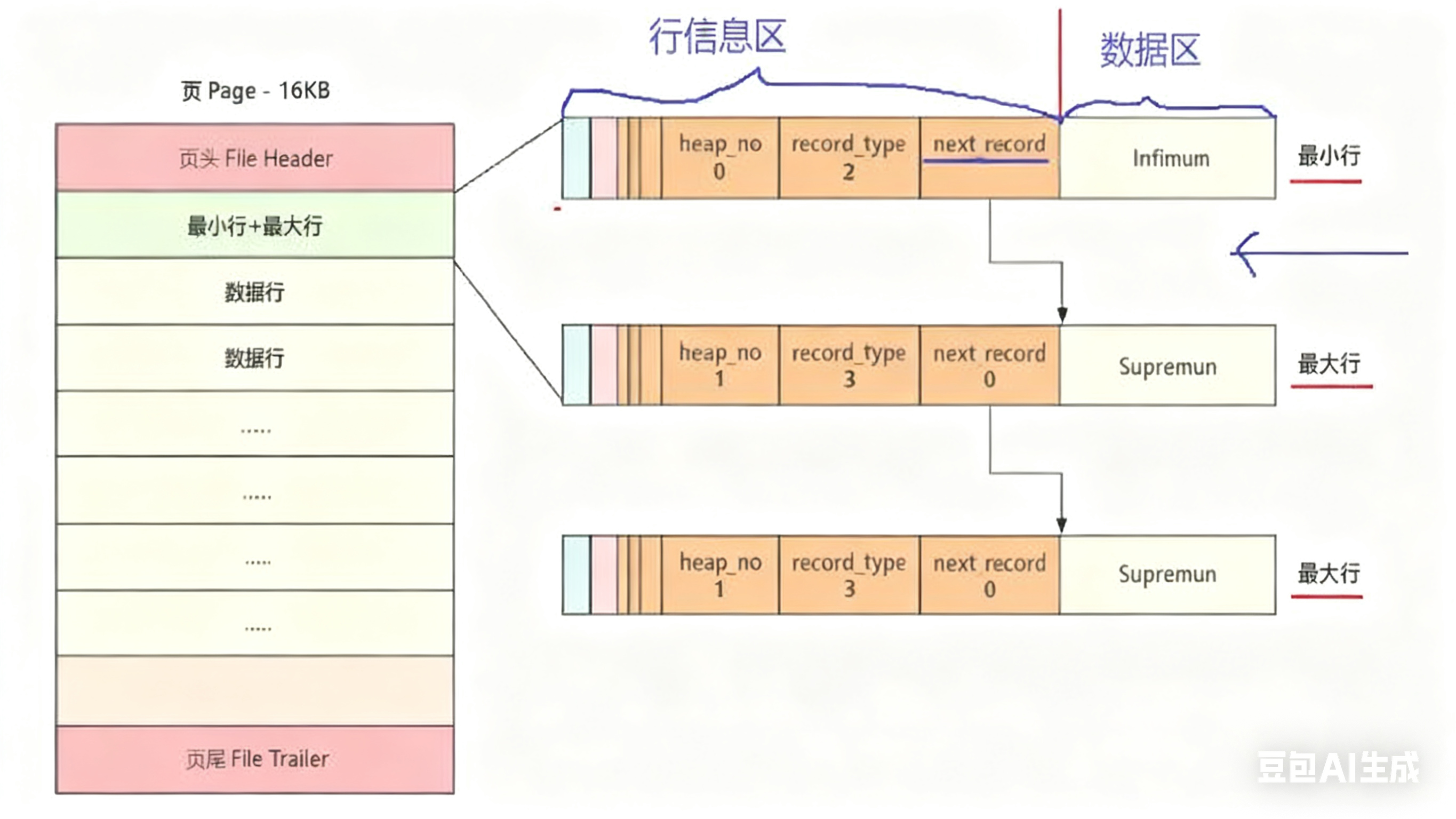 页主体部分时保存真实数据的主要区域,每当创建一个新页,都会自动分配两个行,一个是页内最小行Infimun,另一个页内最大行Supermun,这两个行并不存储任何真实信息,而是做为数据行链表的头和尾,第一个数据行有一个记录下一行的地址偏移量的区域next_record将页内所有数据行组成了一个单向链表,此时新页的结构如下所示: