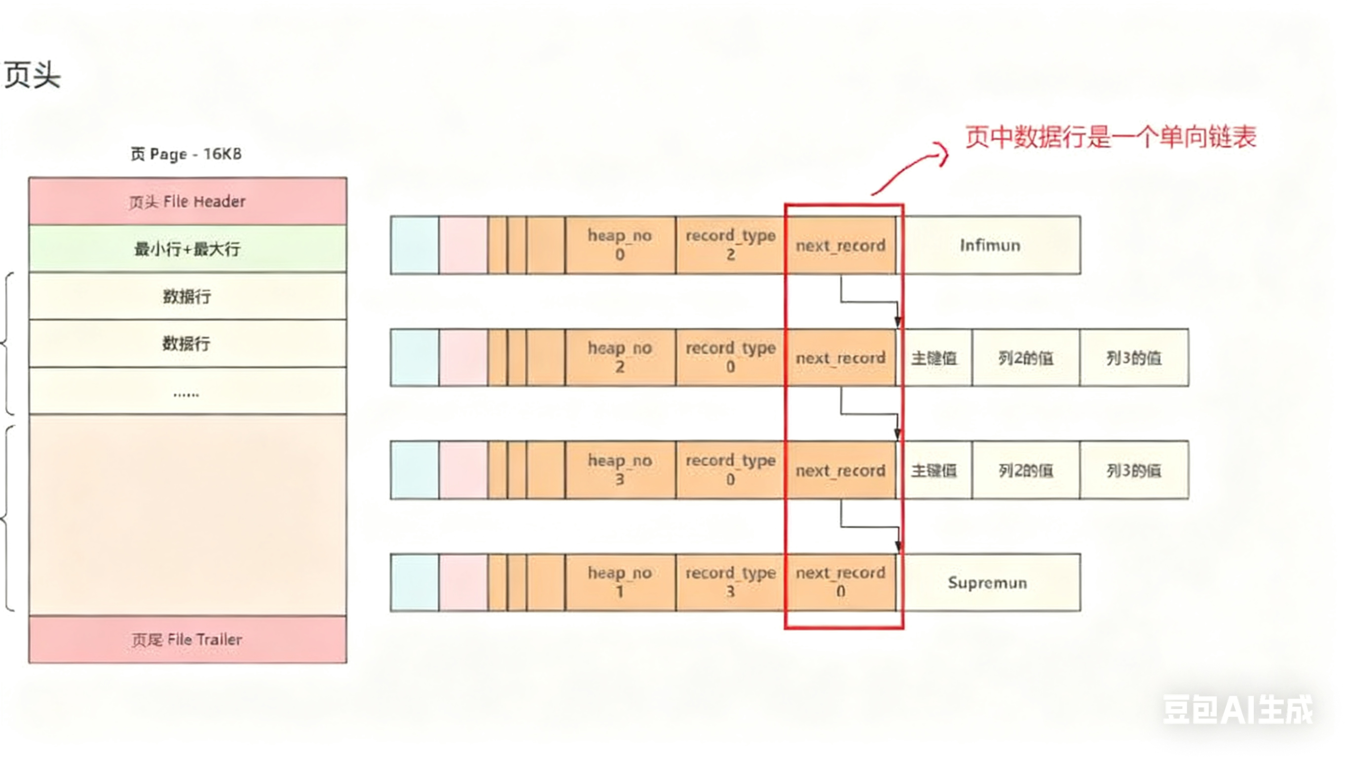 当向一个新页插入数据时,将Infimun连接第一个数据行,最后以行真实数据行连接Supermun,这样数据行就构建成了一个单向链表,更多的行数据插入后,会按照主键从小到大的顺序进行链接,如下图所示:
