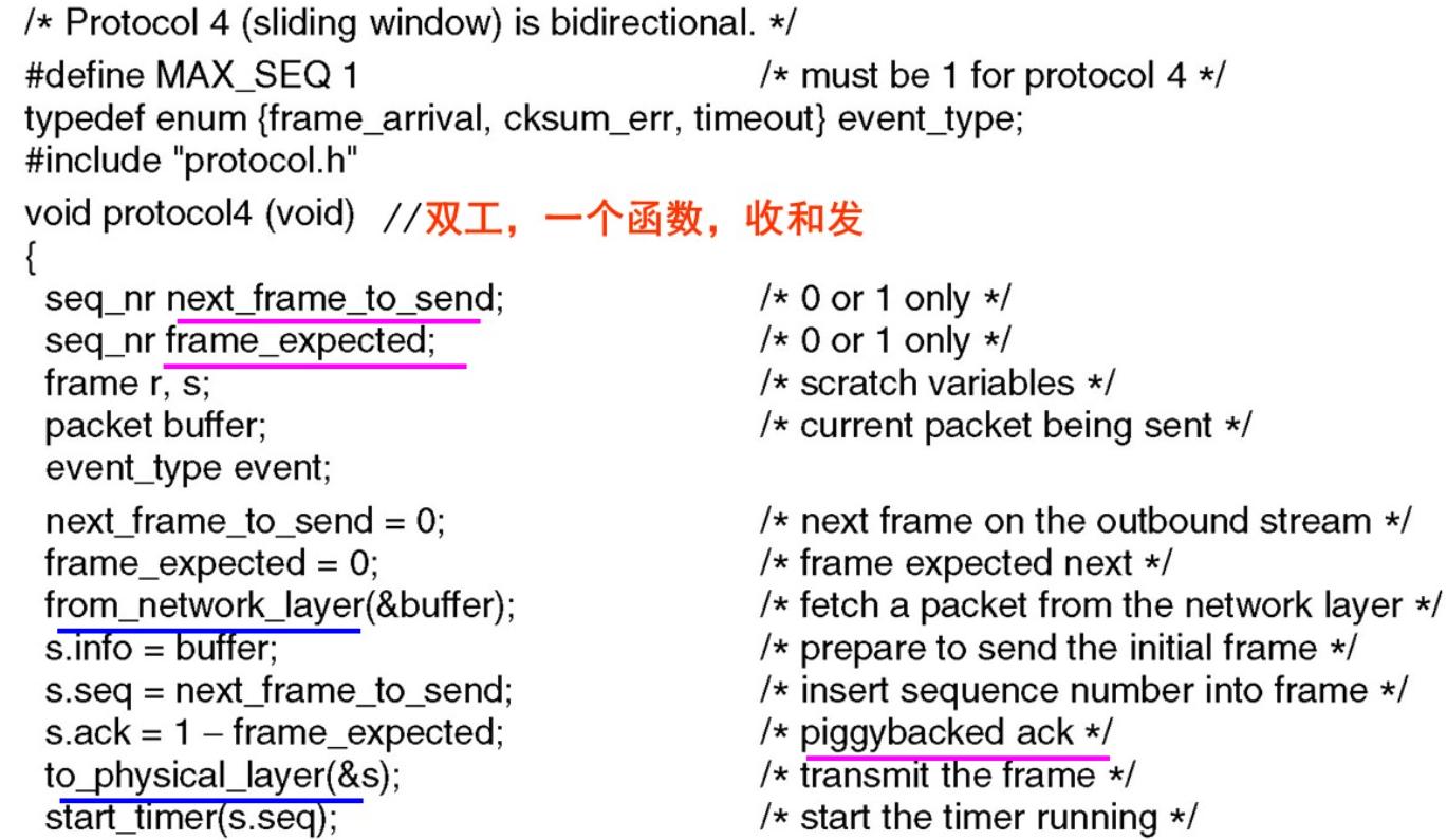 frame | struct { frame_kind kind; seq_nr seq; seq_nr ack; packet info; } | 链路层帧:头部(kind/seq/ack ) + 负载(info ) | 全部协议 |