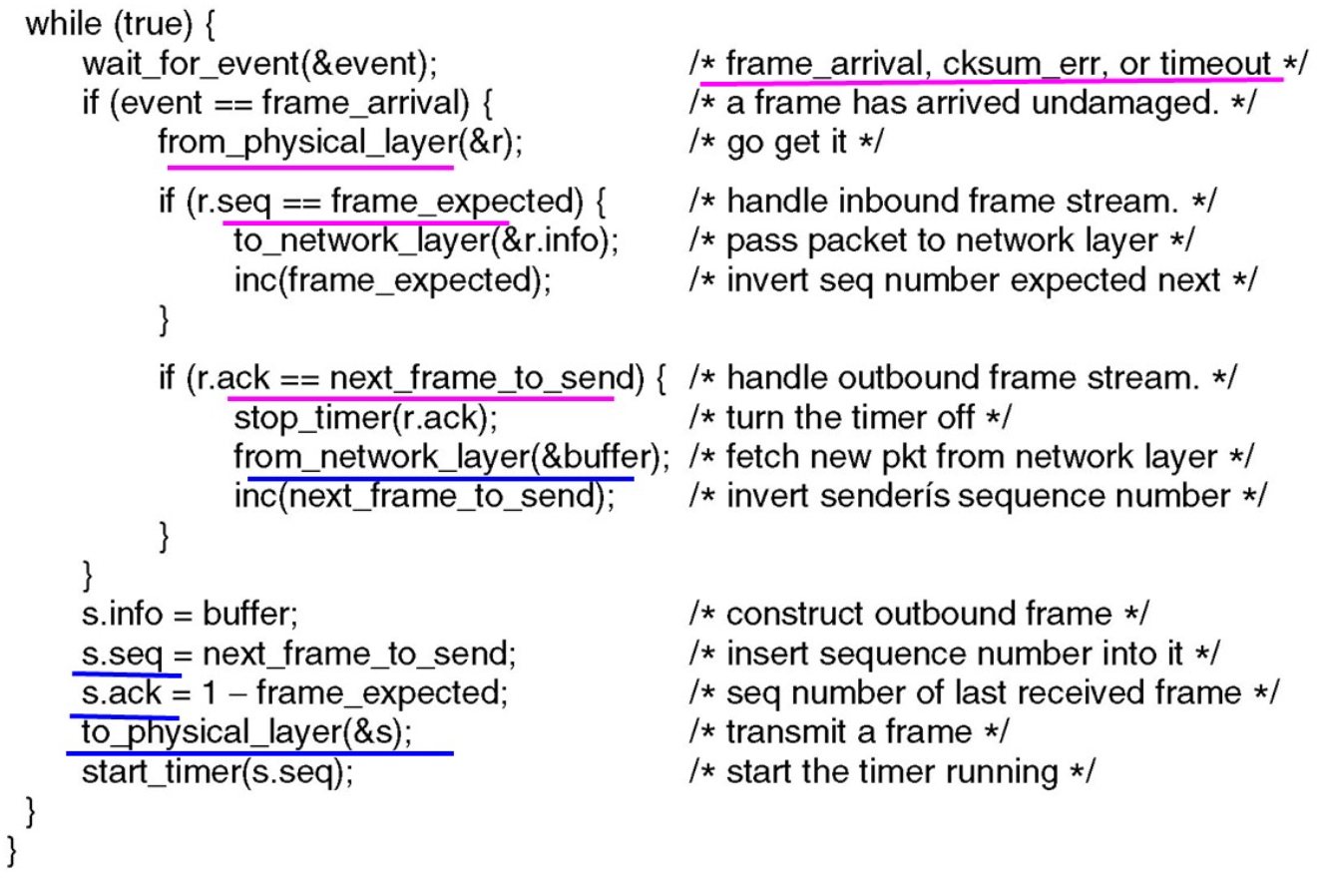 frame_expected | seq_nr (0/1) | 接收窗口左边界 / “期望收到的下一帧编号”;收到期望帧后自增(0↔1) | Prot.3/4 |