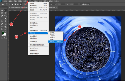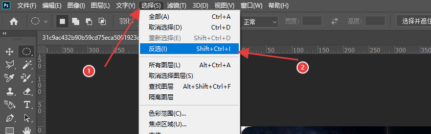 然后点击上方选项栏的选择,然后点击反选,如下所示: