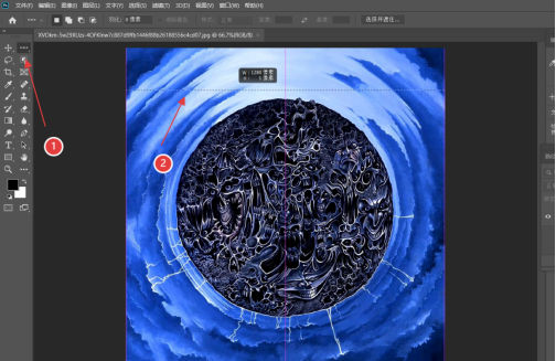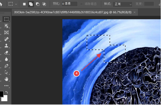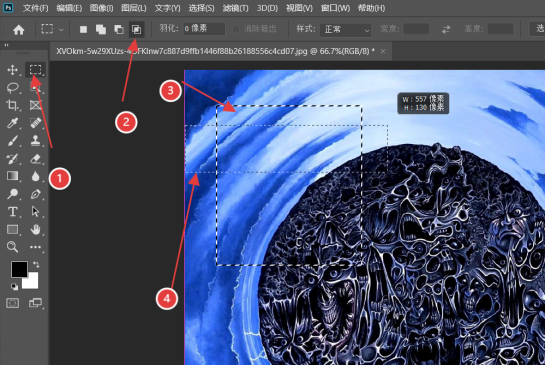 下面介绍PS交叉选区的具体操作,这里首先切换到矩形选区,然后点击上面的交叉选区符号,然后可以在图片中进行两次选区: