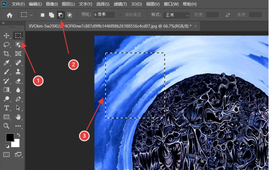 下面介绍PS减选的具体操作,这里首先切换到矩形选区,然后点击上面的减选符号,首先在图中进行第一次选区: