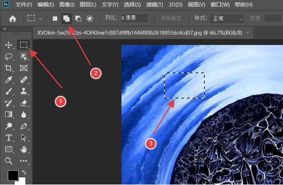 下面介绍PS加选的具体操作,这里首先切换到矩形选区,然后点击上面的加选符号,首先在图中进行第一次选区:
