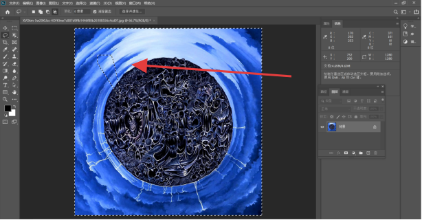 在PS软件中,使用反选操作如下,首先图中进行选区: