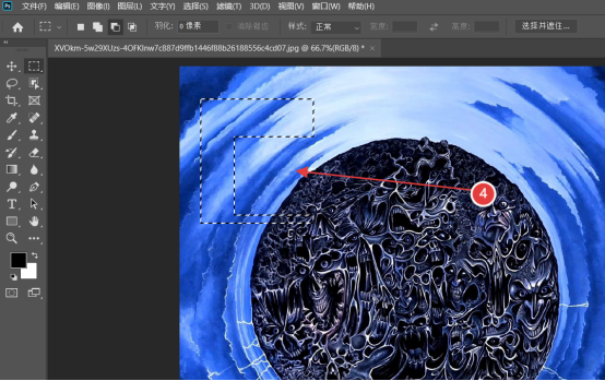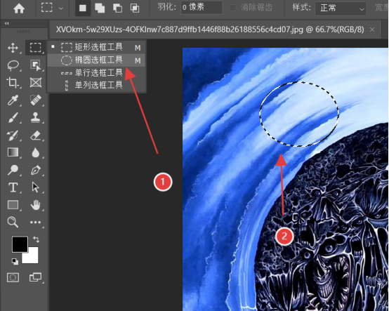 同样PS软件也可以选择其他形状的区域,例如椭圆选择工具。首先将矩形选框工具变化为椭圆选框工具,然后在图片上选择合适的区域: