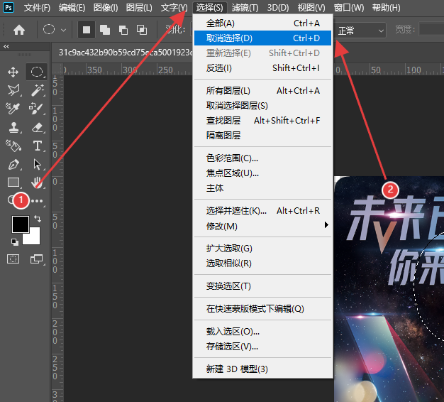 PS除了能全选图片之外,还能够取消现有所有选择,点击上面工作区的选择项,然后点击取消选择,如下所示: