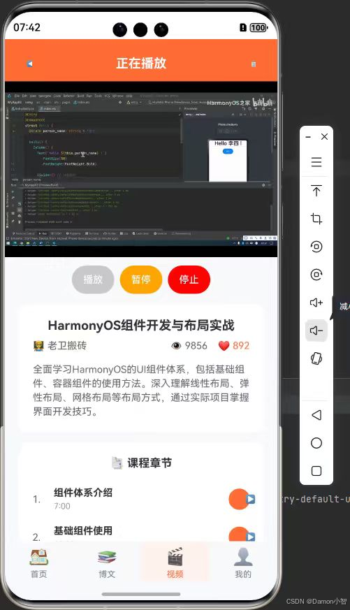 在基础播放器之上,我们实现了更高级的播放器功能,包括播放进度控制、音量调节、倍速播放等。组件通过 State 管理播放状态,包括当前播放时间、视频总时长、是否播放、音量和播放速度。组件生命周期方法 aboutToAppear