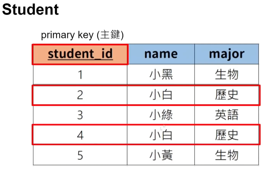 CREATE TABLE student(`student_id` INT ,`name` varchar(100),`major`varchar(100),primary key(`student_id`)