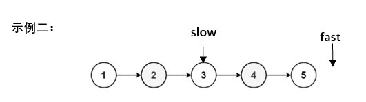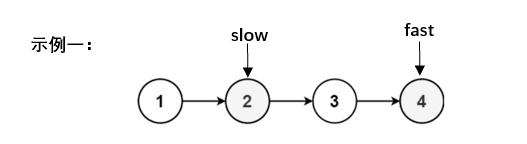 (1)定义快慢双指针slow,fast并初始化,当fast不为空且fast->next不为空时,slow走一步,fast走两步,以示例1(结点数为偶数)和示例2(结点数为奇数)为例,循环结束后指针的指向如下: