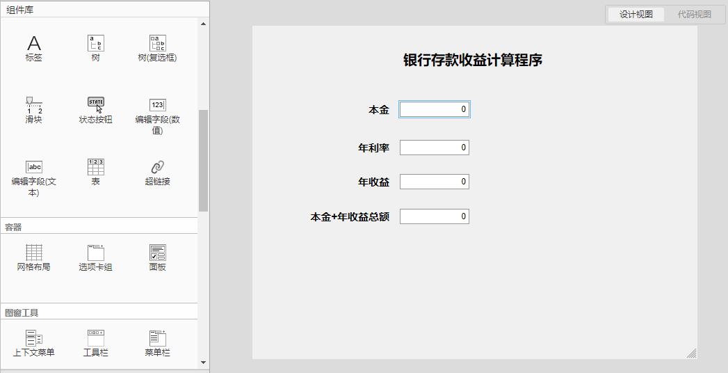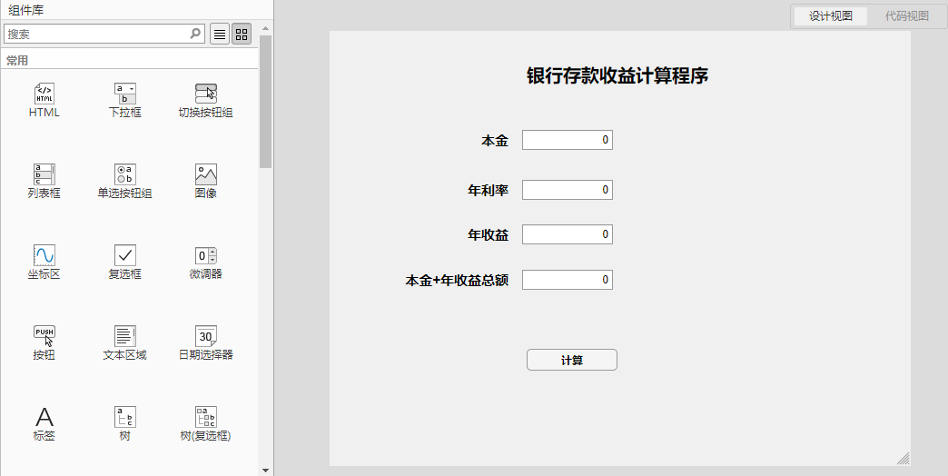 2、将Botton按钮组件拖入到设计视图中,并将名称更改为计算,如下图所示。