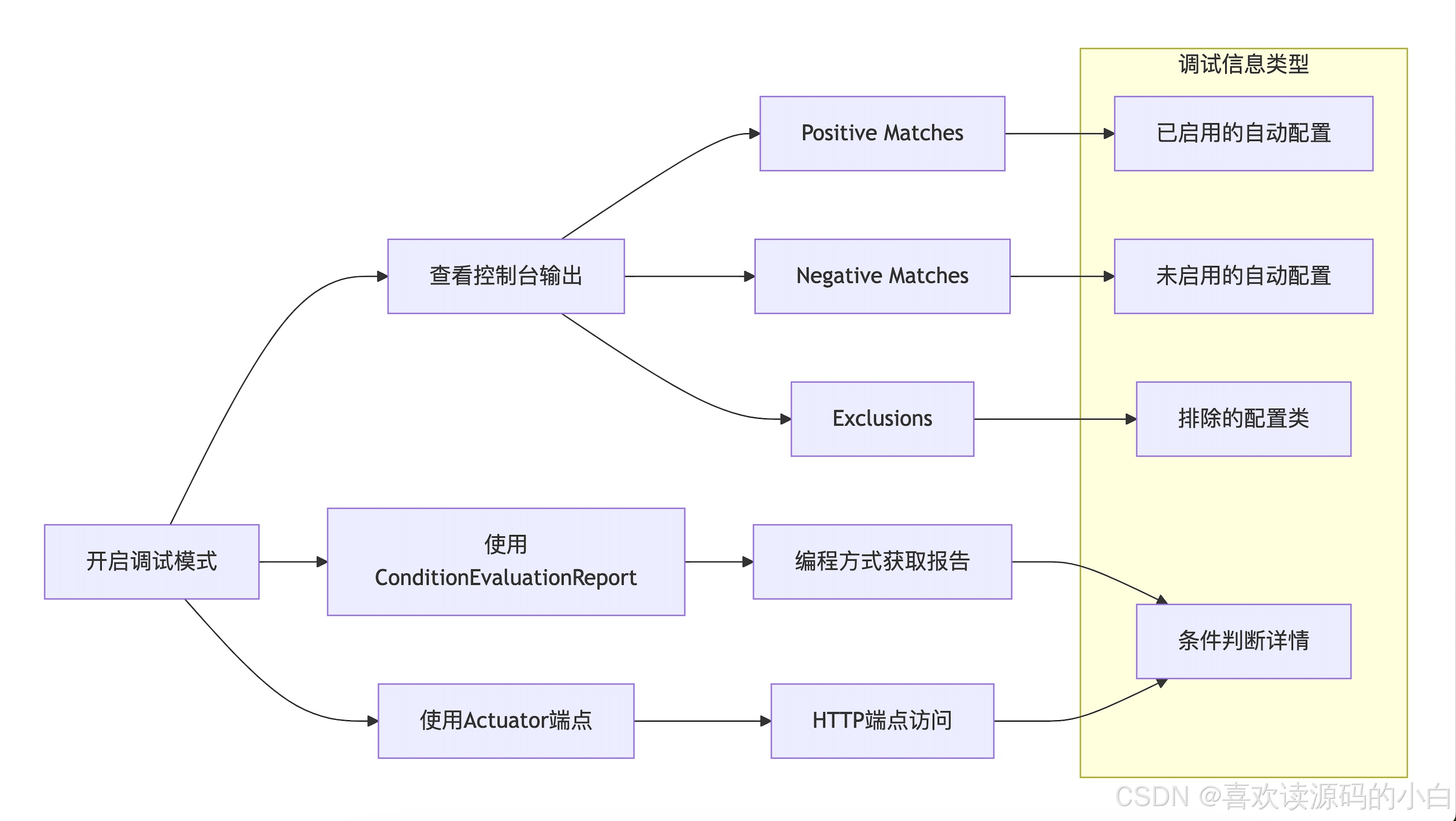 public class DebugController {@Autowiredprivate ApplicationContext applicationContext;@GetMapping("/auto-config-report")public String getAutoConfigReport() {ConditionEvaluationReport report = ConditionEvaluationReport.get(applicationContext.getAutowireCapableBeanFactory());StringBuilder result = new StringBuilder();result.append("=== 自动配置报告 ===\n\n");result.append("已启用的配置类:\n");report.getConditionAndOutcomesBySource().forEach((source, outcomes) -> {if (outcomes.isFullMatch()) {result.append("✓ ").append(source).append("\n");}});return result.toString();}