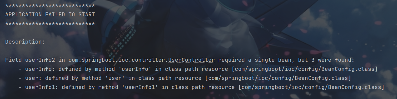 Exception in thread "main" org.springframework.beans.factory.NoUniqueBeanDefinitionException: No qualifying bean of type 'com.springboot.ioc.model.UserInfo' available: expected single matching bean but found 3: userInfo,user,userInfo1at org.springframework.beans.factory.support.DefaultListableBeanFactory.resolveNamedBean(DefaultListableBeanFactory.java:1287)at org.springframework.beans.factory.support.DefaultListableBeanFactory.resolveBean(DefaultListableBeanFactory.java:483)at org.springframework.beans.factory.support.DefaultListableBeanFactory.getBean(DefaultListableBeanFactory.java:338)at org.springframework.beans.factory.support.DefaultListableBeanFactory.getBean(DefaultListableBeanFactory.java:331)at org.springframework.context.support.AbstractApplicationContext.getBean(AbstractApplicationContext.java:1148)at com.springboot.ioc.IoCApplication.main(IoCApplication.java:18)