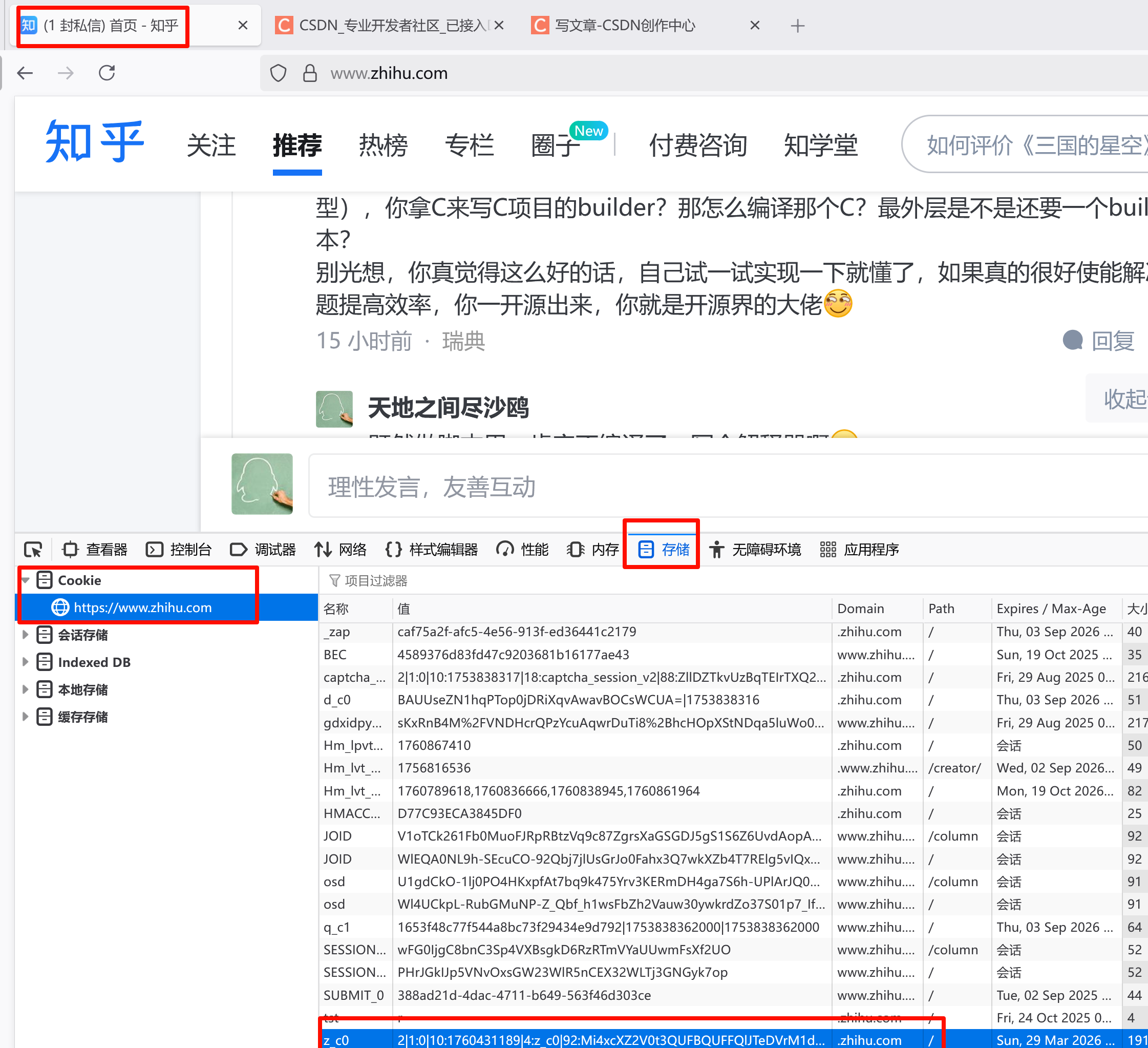 打开知乎专栏的时候,它只会显示一部分专栏中的文章,但是滚动鼠标的话,页面会刷新,专栏中的文章会逐步列出来,直至全部完成。如果知道了所有这些文章的ID,那么利用知乎的API就能很容易获取文章的信息,再借助BeautifulSoup,就可以很容易分析内容并保存了。所以这里最关键的是要能够打开知乎专栏并自动化模拟手工滚动鼠标,从而取得所有专栏文章的ID。正好有至少两个库Playwright和Selenium可以实现用浏览器打开知乎专栏并模拟手工滚动鼠标的效果。另外,使用requests库发送查询获取专栏文章总数以及获取文章ID后利用知乎的API读取文章信息,都必须传入知乎的cookie信息以作为登录用户进行操作。以我使用的Firefox浏览器为例,打开知乎,按F12键调出开发者工具,如下图所示可以找到自己的知乎cookie: