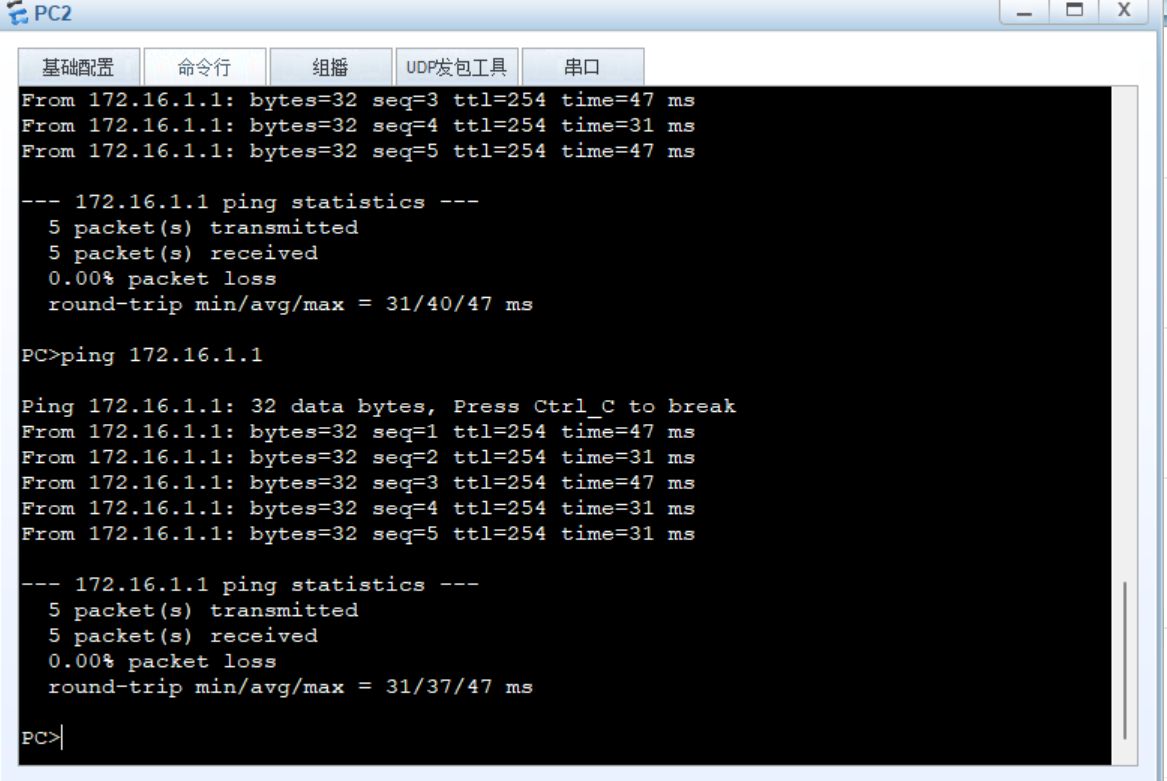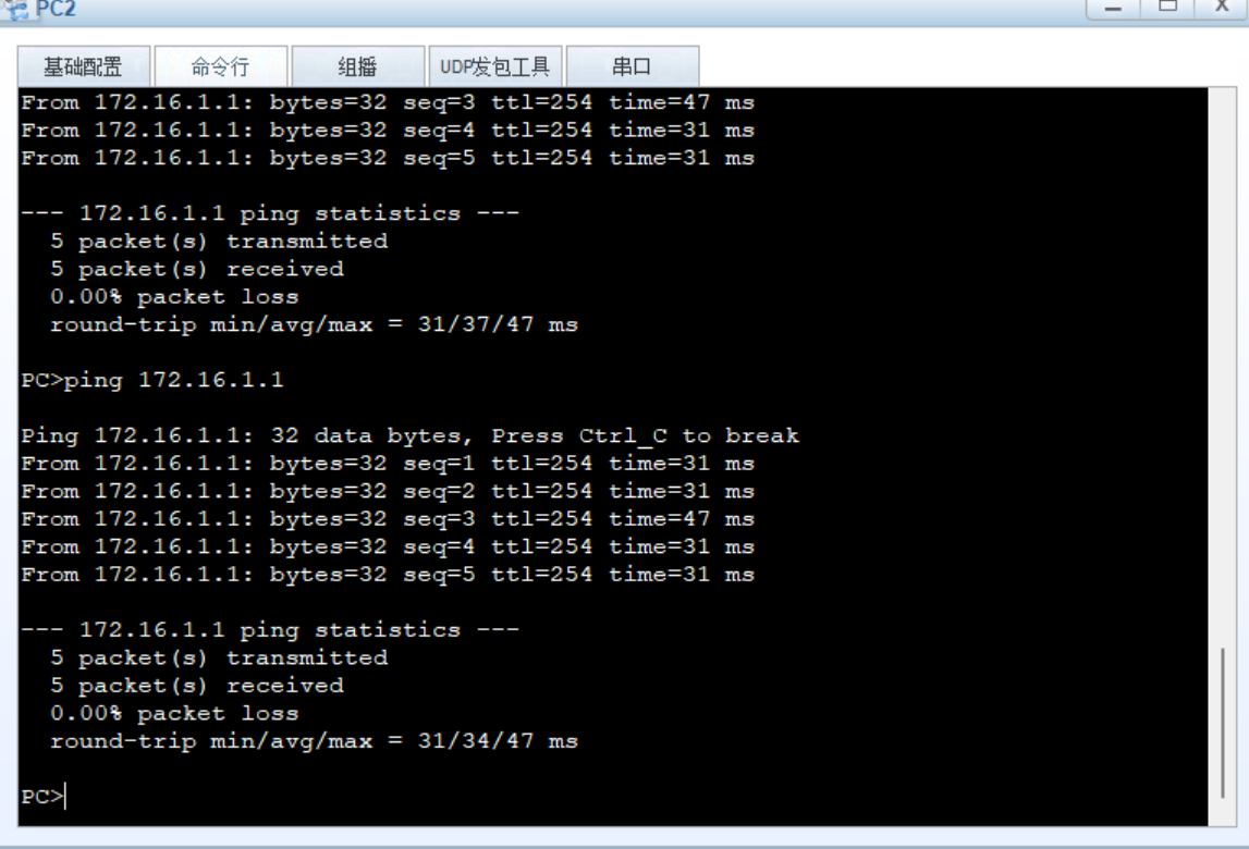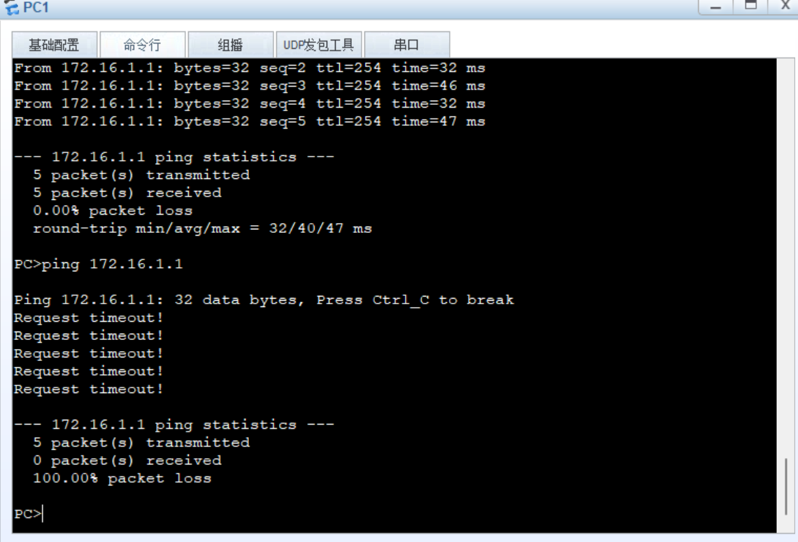 此时,就完成了PC1无法 Ping 通路由器,而PC2 不受任何影响