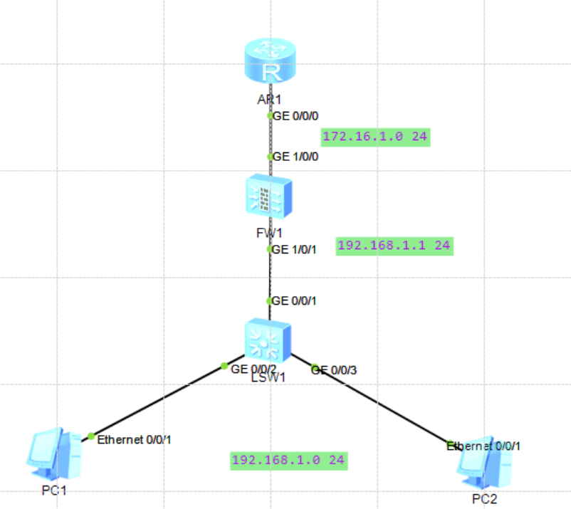 路由器 [R1] int g0/0/0 [R1-GigabitEthernet0/0/0]ip add 172.16.1.1 24 [R1]ip route-static 192.168.1.0 255.255.255.0 172.16.1.2 防火墙 接口配置 [FW1]int g1/0/0 [FW1-GigabitEthernet1/0/0]ip add 172.16.1.2 24 [FW1-GigabitEthernet1/0/0]service-manage ping permit [FW1-GigabitEthernet1/0/0]q [FW1]int g1/0/1 [FW1-GigabitEthernet1/0/1]ip add 192.168.1.1 24 [FW1-GigabitEthernet1/0/1]service-manage ping permit 划分区域 [FW1]firewall zone trust [FW1-zone-trust]add interface GigabitEthernet 1/0/1[FW1]firewall zone dmz [FW1-zone-dmz]add interface GigabitEthernet 1/0/0 配置安全策略 [FW1]security-policy [FW1-policy-security]rule name t-to-dmz [FW1-policy-security-rule-t-to-dmz]source-zone trust [FW1-policy-security-rule-t-to-dmz]destination-zone dmz [FW1-policy-security-rule-t-to-dmz]action permit