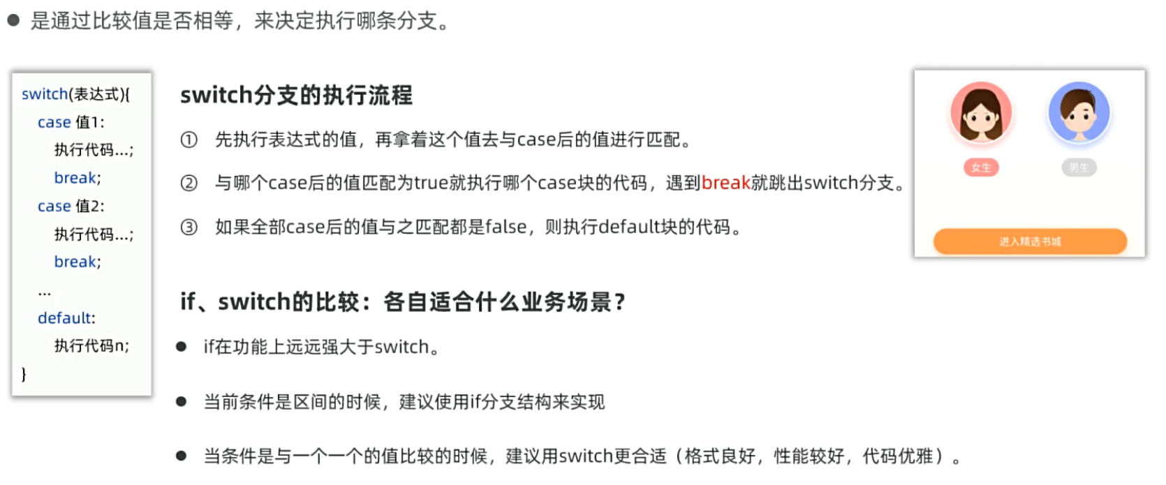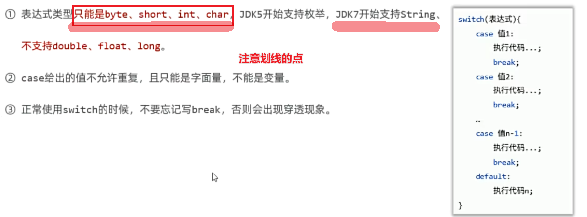 - break语句:每个 case 后通常需要 break 防止穿透执行