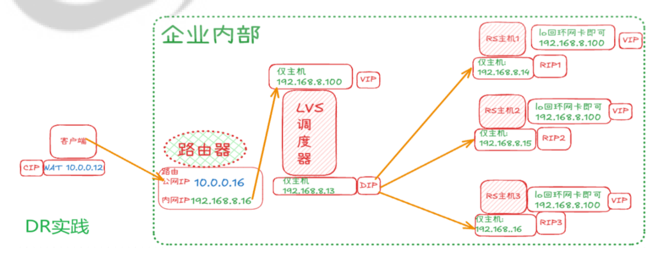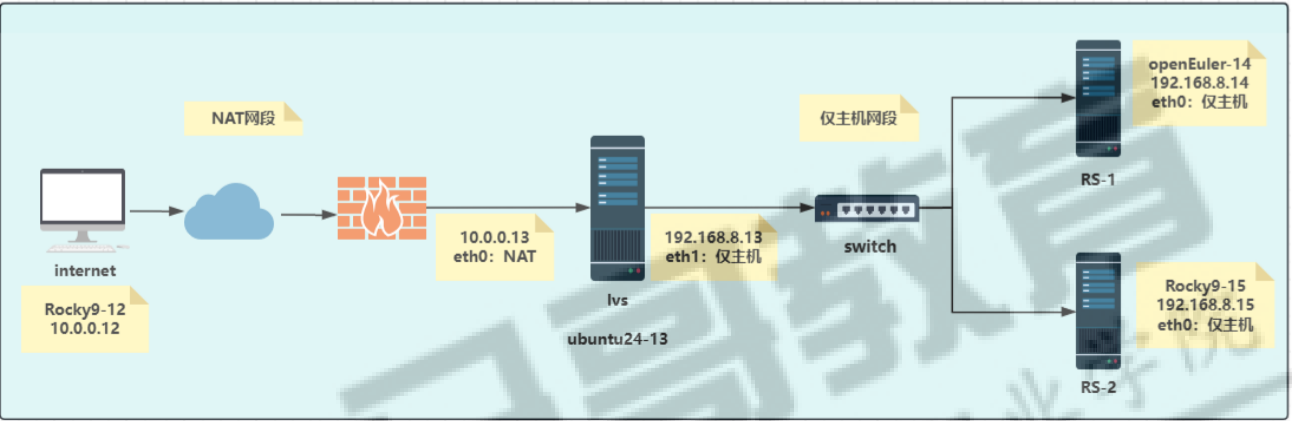 实验环境:两台 Linux 服务器作为 LVS Director Server(Director A:192.168.1.100,Director B:192.168.1.101),两台后端 Real Server(RS1:192.168.1.102,RS2:192.168.1.103,均提供 Web 服务),虚拟 IP(VIP:192.168.1.200)。