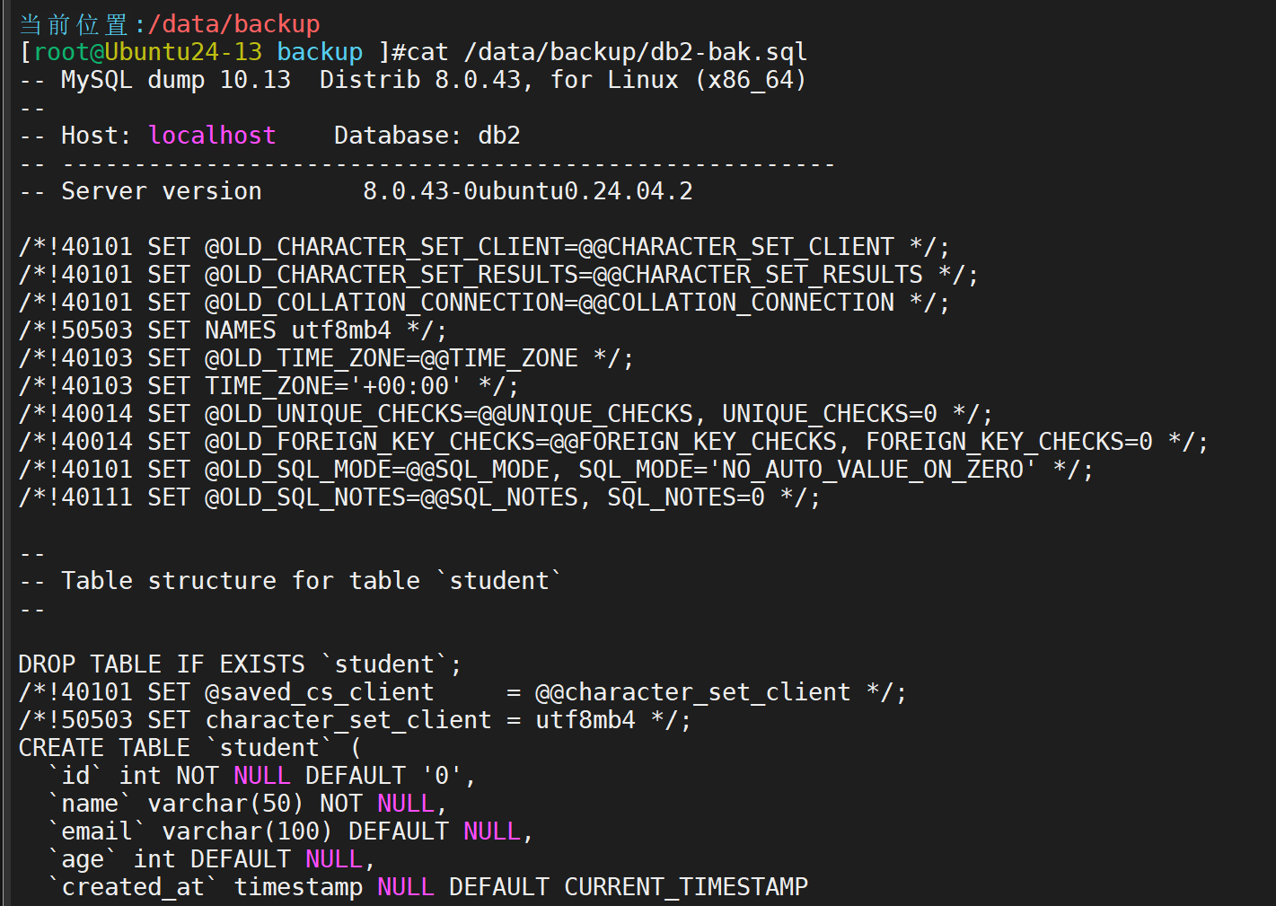 特点:备份文件是文本,可读性强,跨版本 / 跨存储引擎兼容性好;但备份 / 恢复速度慢(需执行 SQL),适合小数据量或需要灵活处理的场景(如迁移表结构)。
