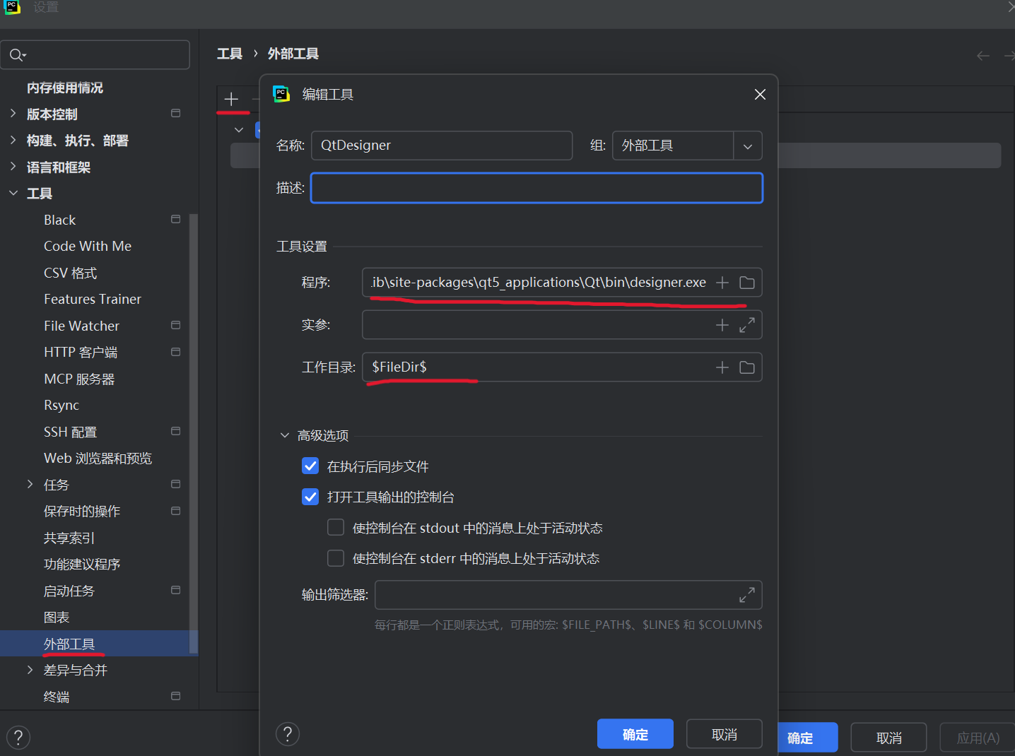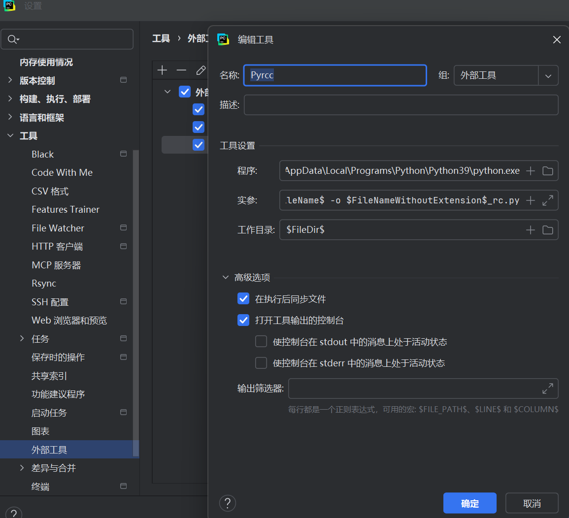 实参为$FileName$ -o $FileNameWithoutExtension$_rc.py