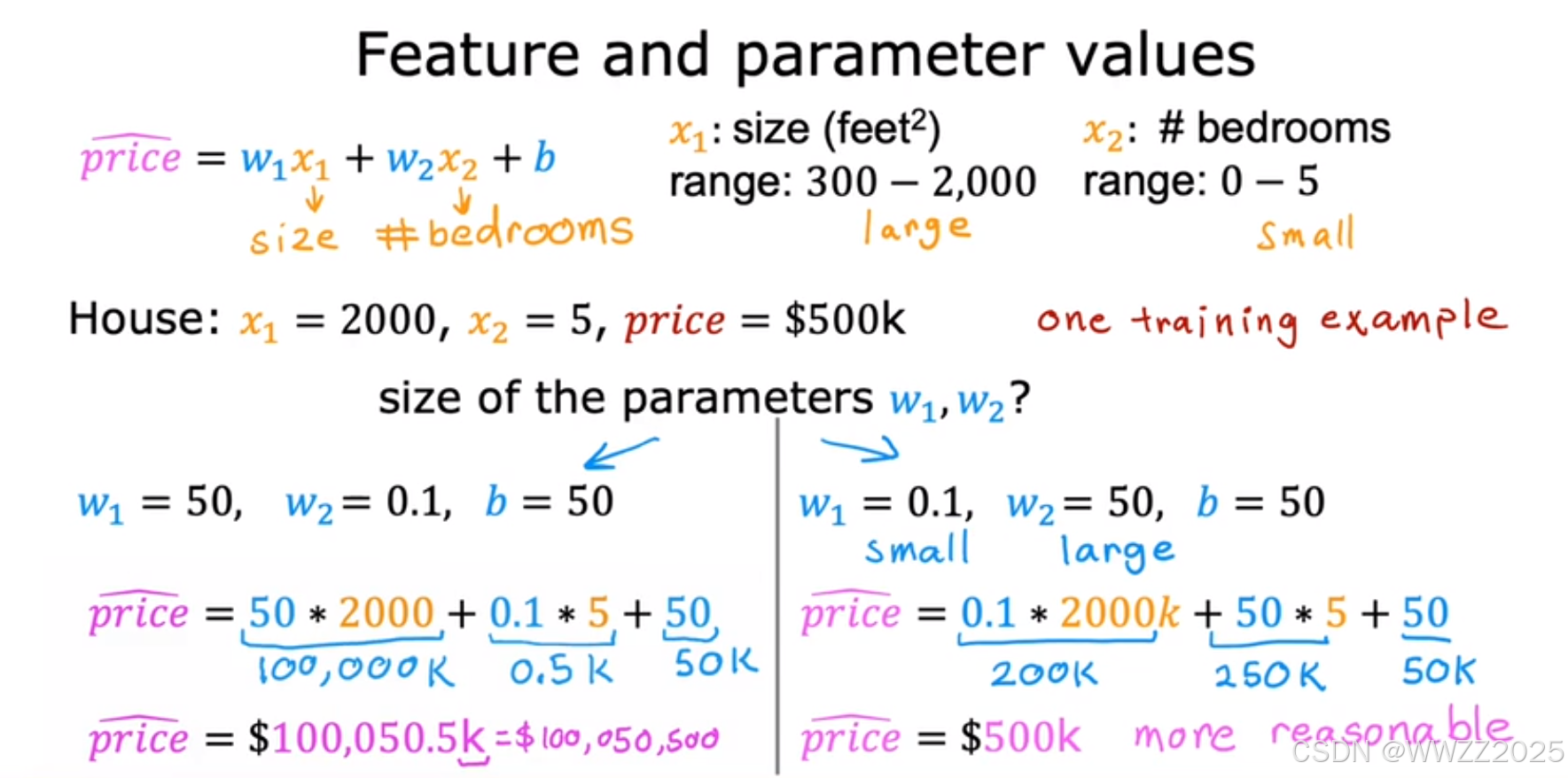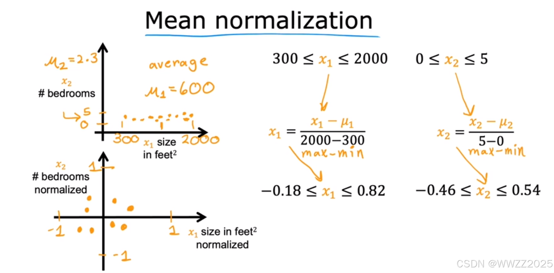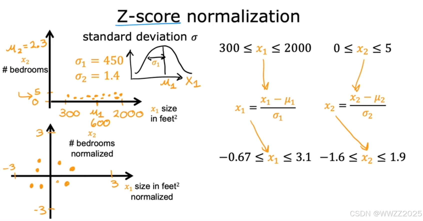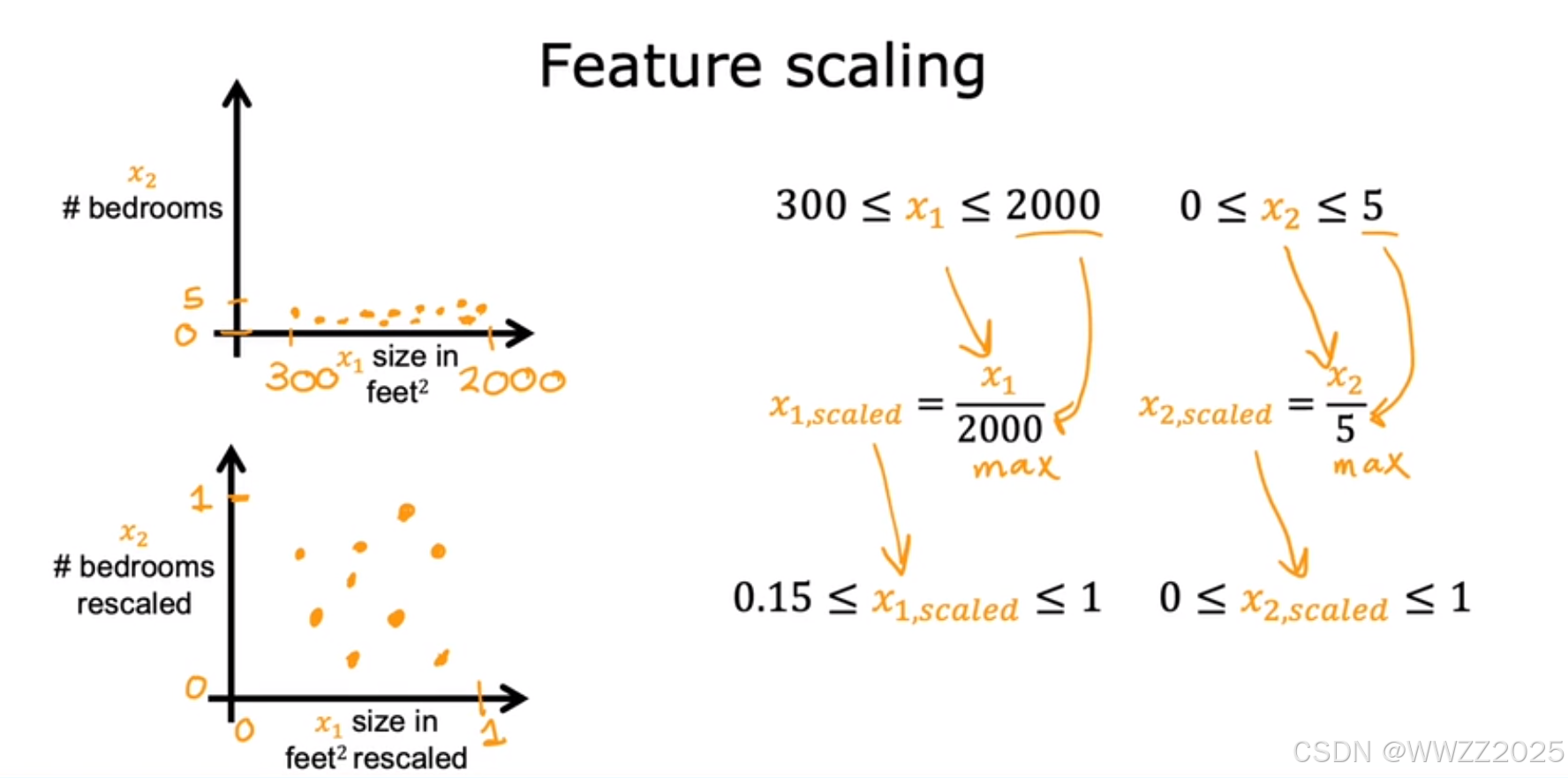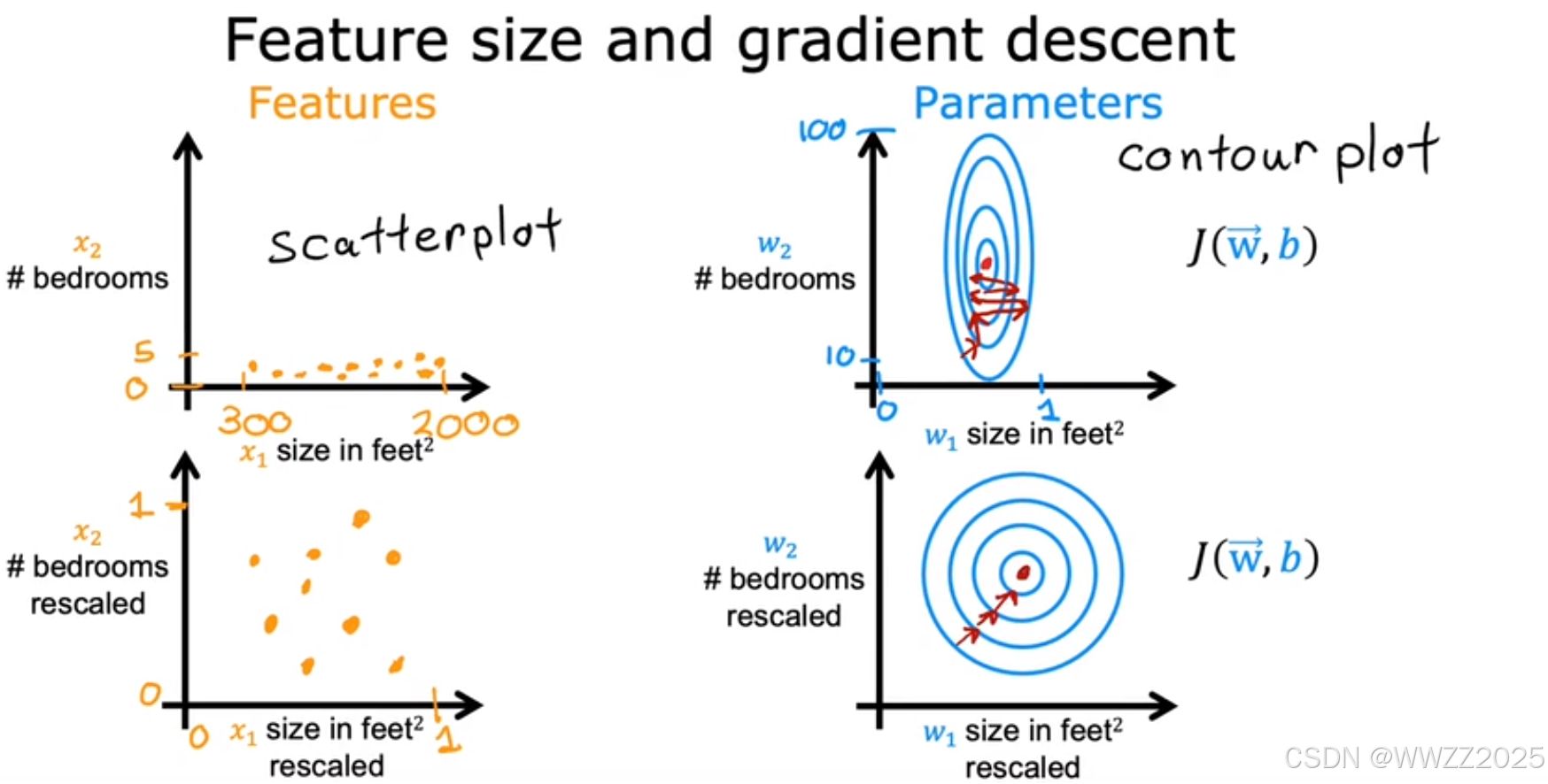 结论:通过缩放w1*x1、w2*x2使其数值差接近,使用转换后的数据运行梯度下降算法,等高线类似于圆,梯度下降可以找到一条更直接的路径到达全局最小值。