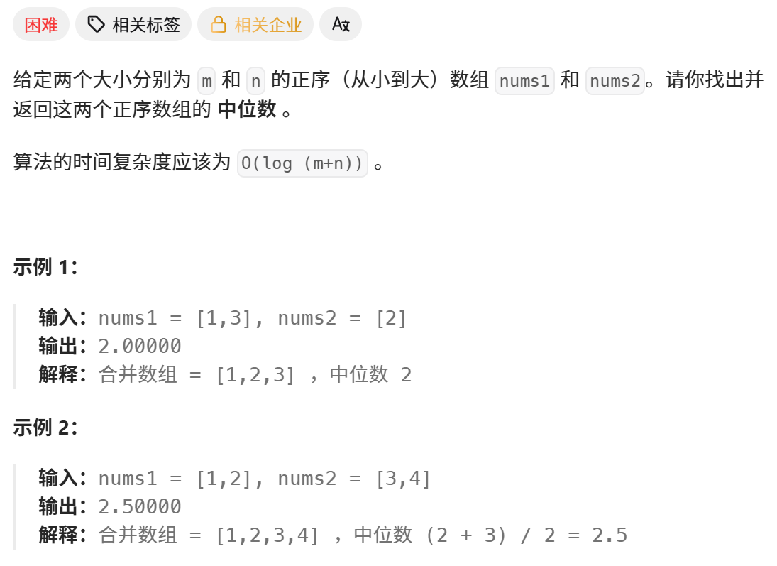 题目:4. 寻找两个正序数组的中位数 - 力扣(LeetCode)
