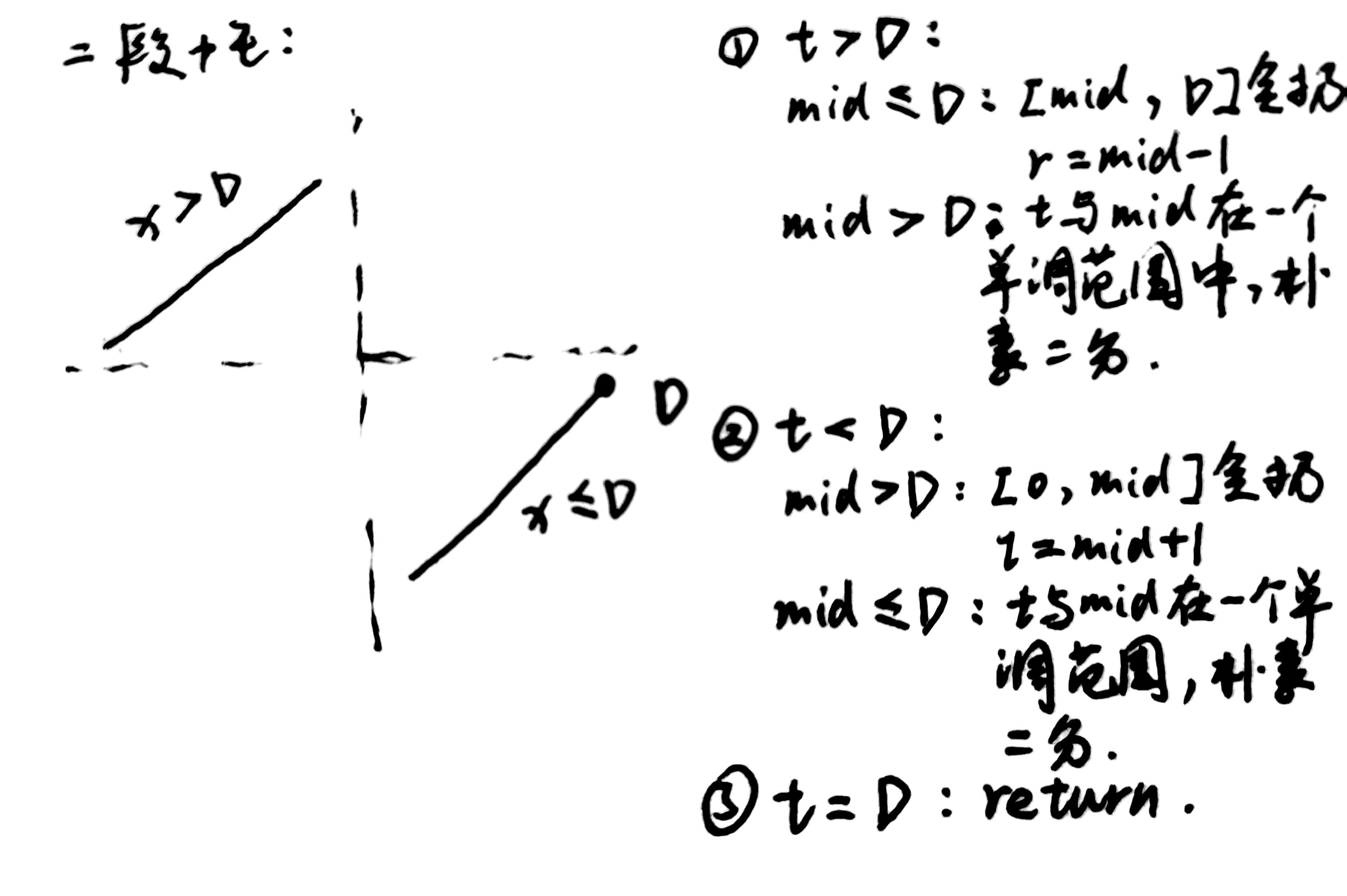 class Solution {public double findMedianSortedArrays(int[] nums1, int[] nums2) {// 如果是奇数,找第 (len1+len2)/2+1 小// 如果是偶数,找第 (len1+len2)/2 小和第 (len1+len2)/2+1,计算均值int len = nums1.length + nums2.length;if (len % 2 == 1) return getKthMin(nums1, nums2, len/2+1);else return (getKthMin(nums1, nums2, len/2) + getKthMin(nums1, nums2, len/2+1))/2.0;}public int getKthMin(int[] nums1, int[] nums2, int k) {int index1 = 0, index2 = 0; // 两个数组现在待处理的元素下标int len1 = nums1.length, len2 = nums2.length; while(true) {// 数组1先删完了,返回数组2的第 k 小数if (index1 == len1) return nums2[index2+k-1];// 数组2先删完了,返回数组1的第 k 小数if (index2 == len2) return nums1[index1+k-1];// 数组1和2都还没有删完,但是查找第 k=1 小,返回两个数组第一个数较小的if (k == 1) return Math.min(nums1[index1], nums2[index2]);// 正常情况// 删除两个数组中,第 k/2 小数较小的数,及其前 k/2-1 个数,这 k/2 个数必定不是第 k 小数// 有可能数组剩余长度比 k/2 小,这时比较数组最后一个数即可int newIndex1 = Math.min(len1-1, index1+k/2-1);int newIndex2 = Math.min(len2-1, index2+k/2-1); // 删除前更新 kif (nums1[newIndex1] <= nums2[newIndex2]) {k -= newIndex1-index1+1;index1 = newIndex1+1;}else {k -= newIndex2-index2+1;index2 = newIndex2+1;}}}