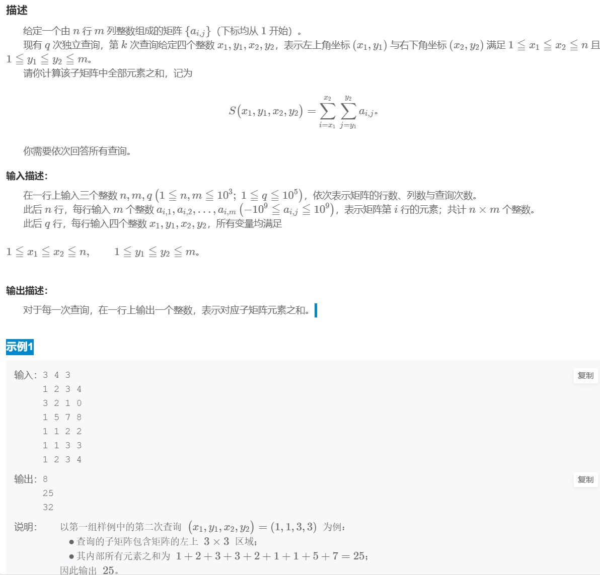 ① 暴力解法:询问 q 次,每次最坏遍历 mn 个元素求和。时间复杂度 O(qmn)。
