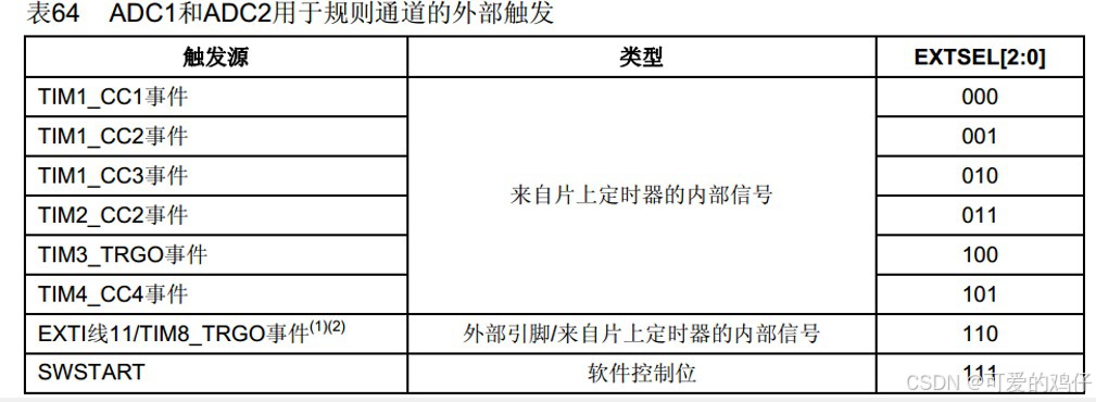 函数(后者用于开启中断方式的转换)来实现软件触发;在标准库中,一般是通过操作 ADC 的控制寄存器(如ADC_CR2
