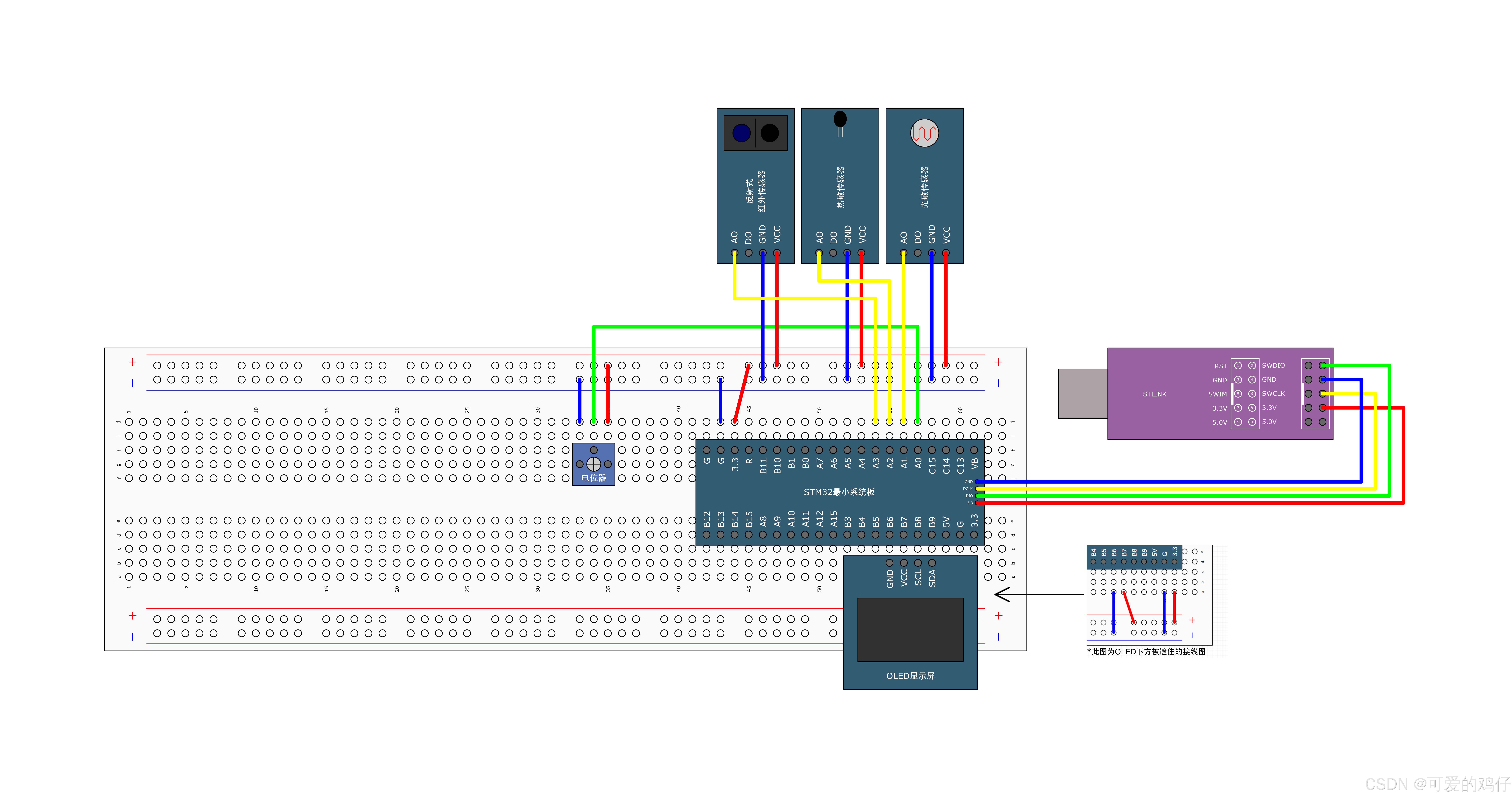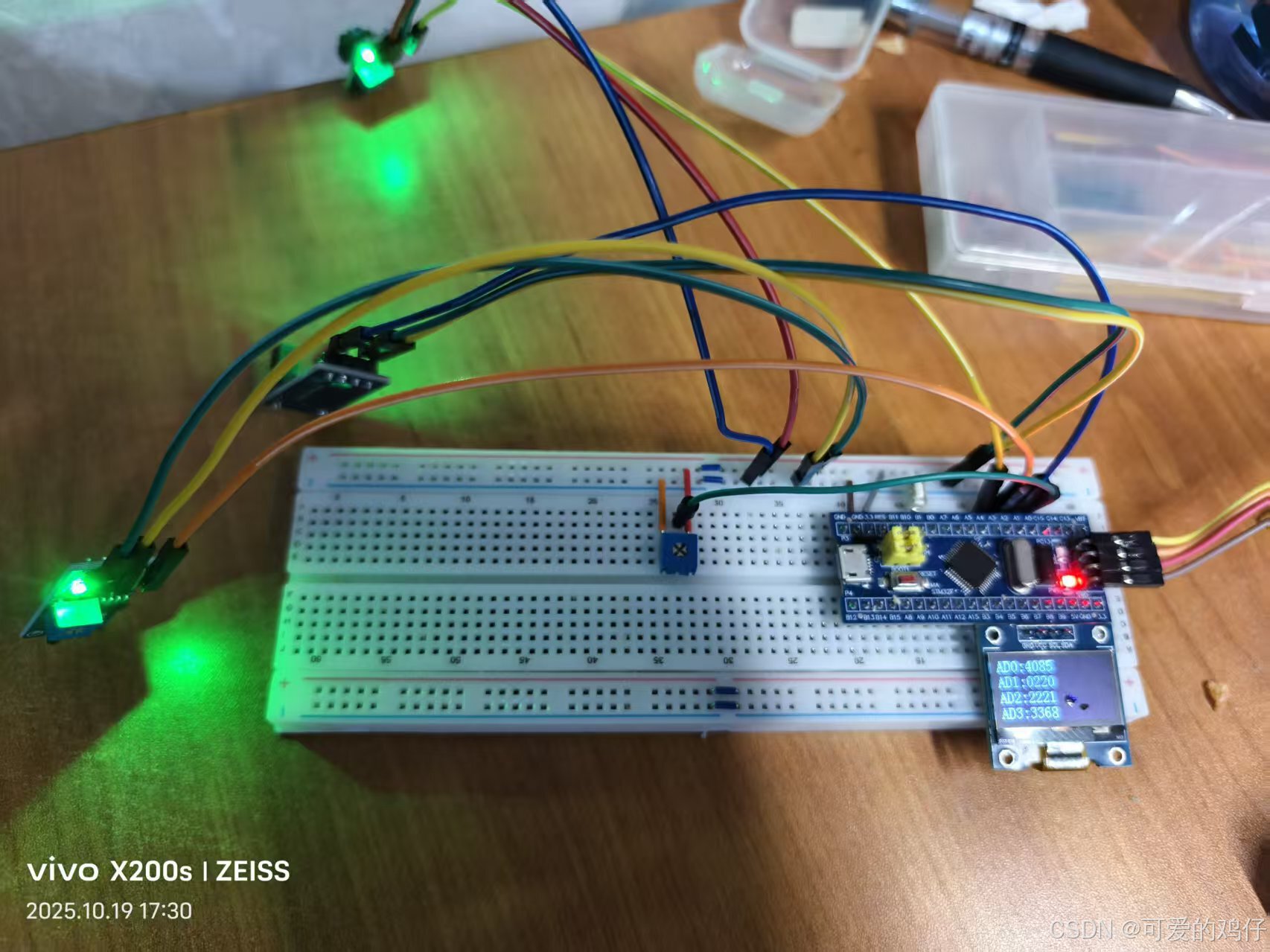 {/*模块初始化*/OLED_Init(); //OLED初始化AD_Init(); //AD初始化/*显示静态字符串*/OLED_ShowString(1, 1, "AD0:");OLED_ShowString(2, 1, "AD1:");OLED_ShowString(3, 1, "AD2:");OLED_ShowString(4, 1, "AD3:");while (1){AD0 = AD_GetValue(ADC_Channel_0); //单次启动ADC,转换通道0AD1 = AD_GetValue(ADC_Channel_1); //单次启动ADC,转换通道1AD2 = AD_GetValue(ADC_Channel_2); //单次启动ADC,转换通道2AD3 = AD_GetValue(ADC_Channel_3); //单次启动ADC,转换通道3OLED_ShowNum(1, 5, AD0, 4); //显示通道0的转换结果AD0OLED_ShowNum(2, 5, AD1, 4); //显示通道1的转换结果AD1OLED_ShowNum(3, 5, AD2, 4); //显示通道2的转换结果AD2OLED_ShowNum(4, 5, AD3, 4); //显示通道3的转换结果AD3Delay_ms(100); //延时100ms,手动增加一些转换的间隔时间}