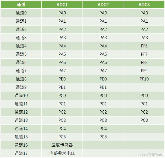 - 通道数量:最多支持 16 个外部模拟通道(对应 GPIO 引脚)+ 多个内部通道(如温度传感器、内部参考电压 VREFINT、VBAT 电池电压等)。