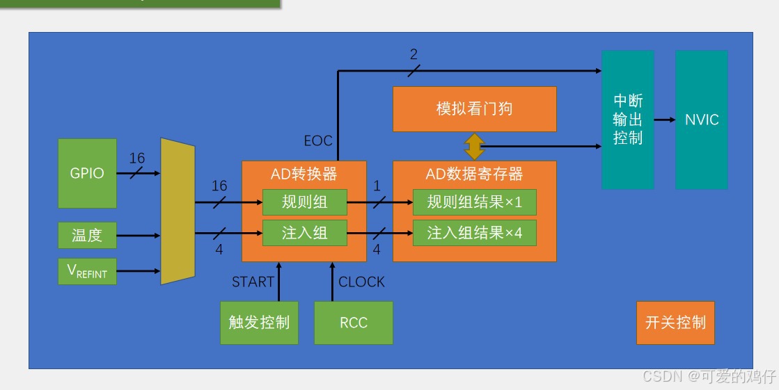 - 触发控制(START):用于启动 ADC 转换,可以是软件触发(通过程序指令启动),也可以是硬件触发(如定时器触发、外部引脚触发等)。