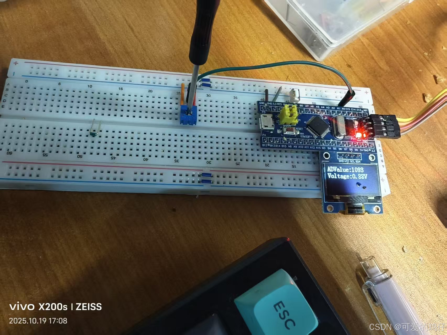 {/*模块初始化*/OLED_Init(); //OLED初始化AD_Init(); //AD初始化/*显示静态字符串*/OLED_ShowString(1, 1, "ADValue:");OLED_ShowString(2, 1, "Voltage:0.00V");while (1){ADValue = AD_GetValue(); //获取AD转换的值Voltage = (float)ADValue / 4095 * 3.3; //将AD值线性变换到0~3.3的范围,表示电压OLED_ShowNum(1, 9, ADValue, 4); //显示AD值OLED_ShowNum(2, 9, Voltage, 1); //显示电压值的整数部分OLED_ShowNum(2, 11, (uint16_t)(Voltage * 100) % 100, 2); //显示电压值的小数部分Delay_ms(100); //延时100ms,手动增加一些转换的间隔时间}
