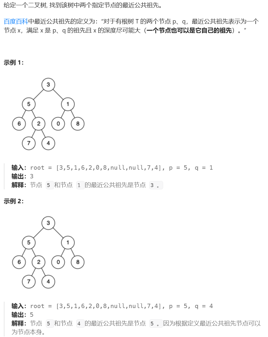 public:bool GetPath(TreeNode* root, TreeNode* x, stack<TreeNode*>& path){//深度遍历的前序查找,顺便用栈记录路径if(root == nullptr)return false;path.push(root);if(root == x)return true;if(GetPath(root->left, x, path))return true;if(GetPath(root->right, x, path))return true;path.pop();return false;}TreeNode* lowestCommonAncestor(TreeNode* root, TreeNode* p, TreeNode* q) {stack<TreeNode*> pPath, qPath;GetPath(root, p, pPath);GetPath(root, q, qPath);//找交点while(pPath.size() != qPath.size()){//长的先走if(pPath.size() > qPath.size()){pPath.pop();}else{qPath.pop();}}//再同时走找交点while(pPath.top() != qPath.top()){pPath.pop();qPath.pop();}return pPath.top();}