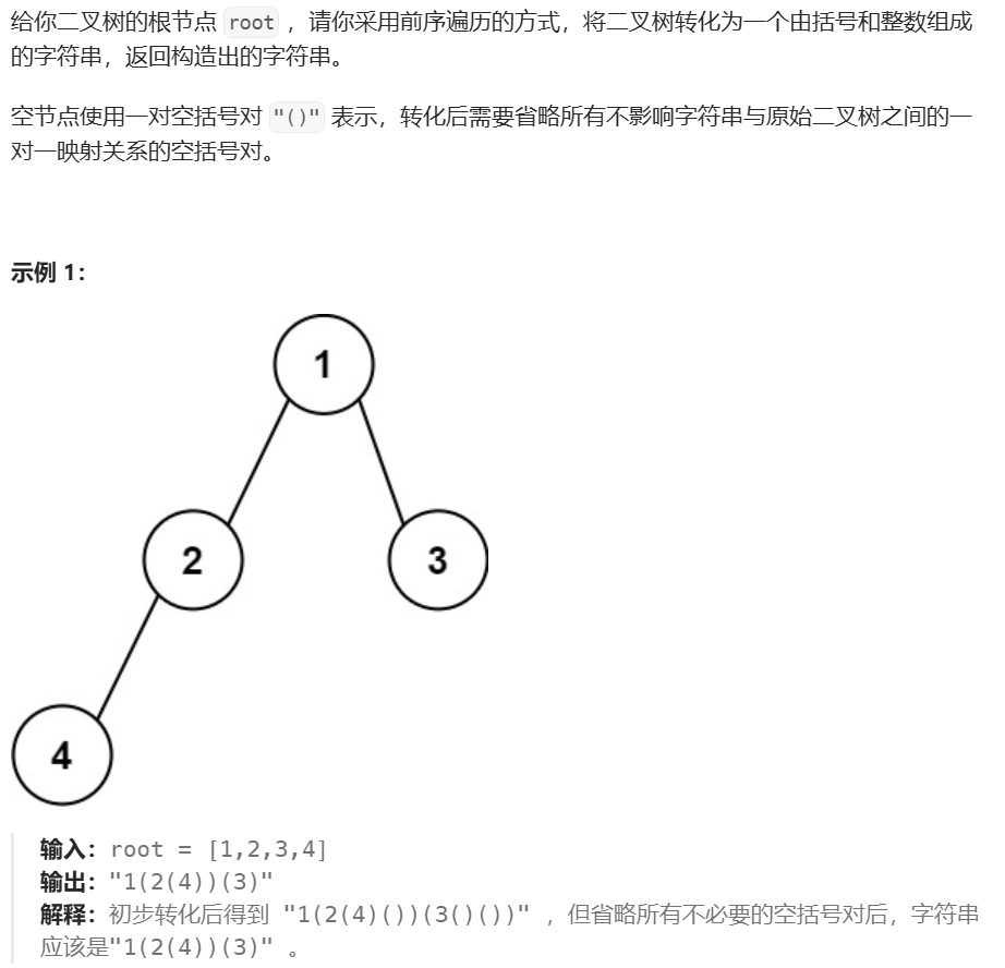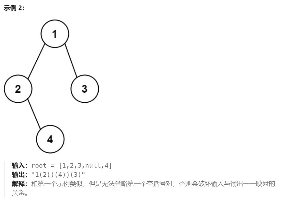 public:string tree2str(TreeNode* root) {string str;if(root == nullptr)return str;str += to_string(root->val);// 左不为空,需要递归获取子树括号括起来// 左为空,右不为空,左边的空括号需要保留if(root->left || root->right){str += '(';str += tree2str(root->left);str += ')';}// 右不为空,需要递归获取子树括号括起来// 右边只要是空,空括号就不需要了if(root->right){str += '(';str += tree2str(root->right);str += ')';}return str;}