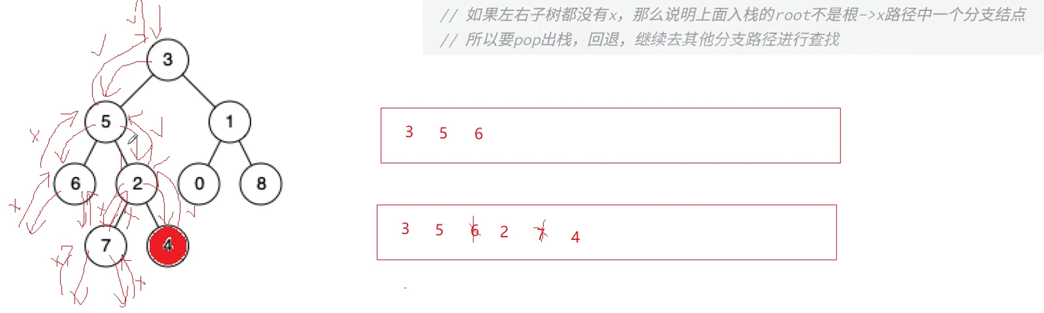算法思路2:如果能求出两个结点到根结点的路径,那么就可以转换为链表相交问题。比如:6到3的路径为6->5->3,4到3的路径为4->2->5->3,那么看做两个链表找交点,交点5就是最近公共祖先。如果是三叉链的话就很好获取路径,但是这里是二叉链,该怎么得到路径呢?这里就要用到前序遍历的思路,用栈来记录查找路径,遇到结点先入栈,因为该结点就算不是我们要找的结点x,但是也有可能是分支结点。如果左右子树都没有结点x,那么说明入栈的结点不在路径上,所以要出栈,继续去其他分支路径进行查找。