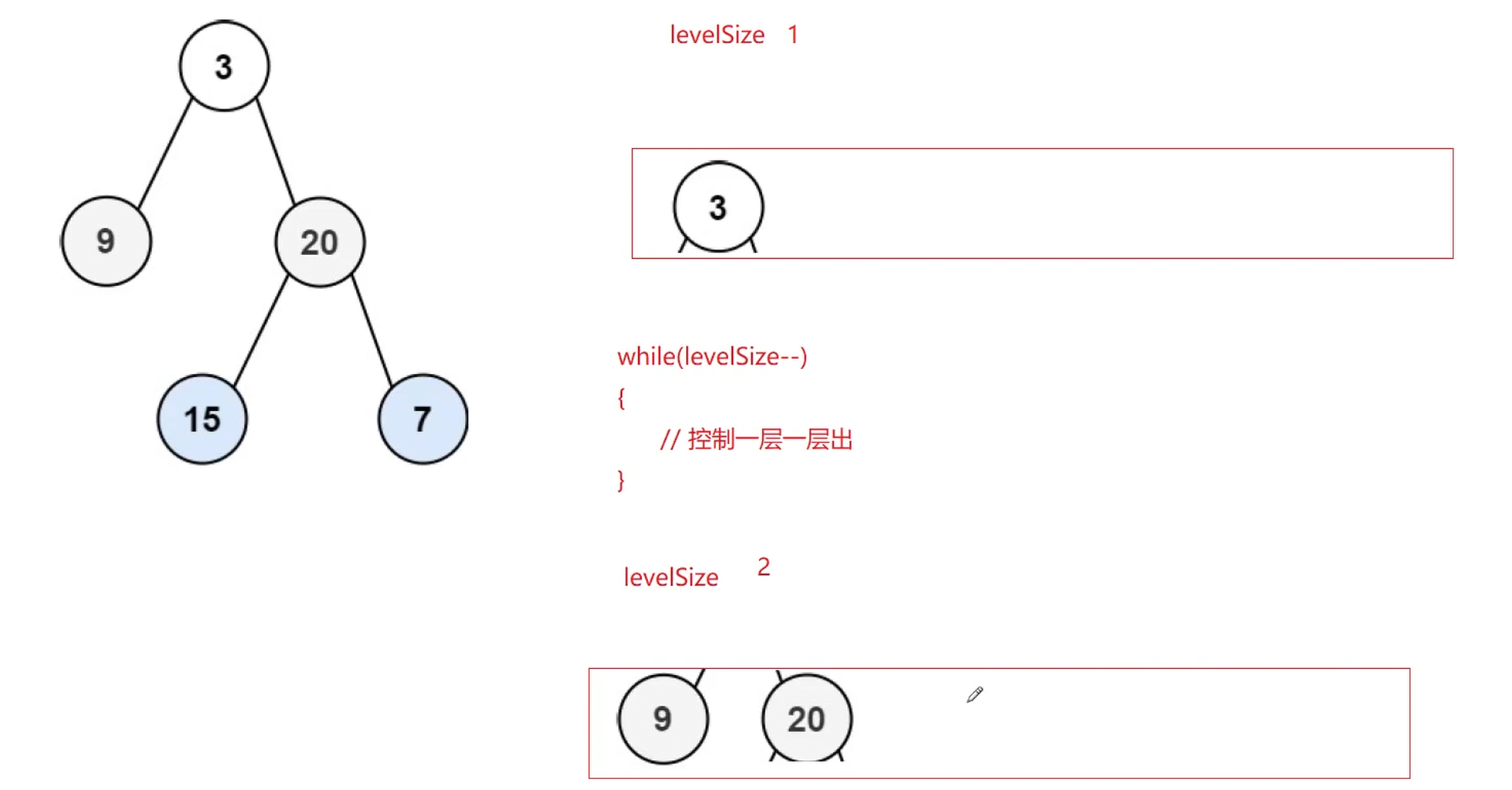 算法思路:在层序遍历的过程中,增加一个levelSize,记录每层的数据个数。树不为空的情况下,第一层levelSize = 1,循环控制,第一层出完了,第二层就都进队列了,队列中size就是第二层的数据个数。以此类推,假设levelSize为第n层的数据个数,因为层序遍历思想为当前层结点出队列,带入下一层结点(也就是子结点),循环控制第n层数据出完了,那么第n+1层结点都进队列了,队列的size就是下一层结点的levelSize。